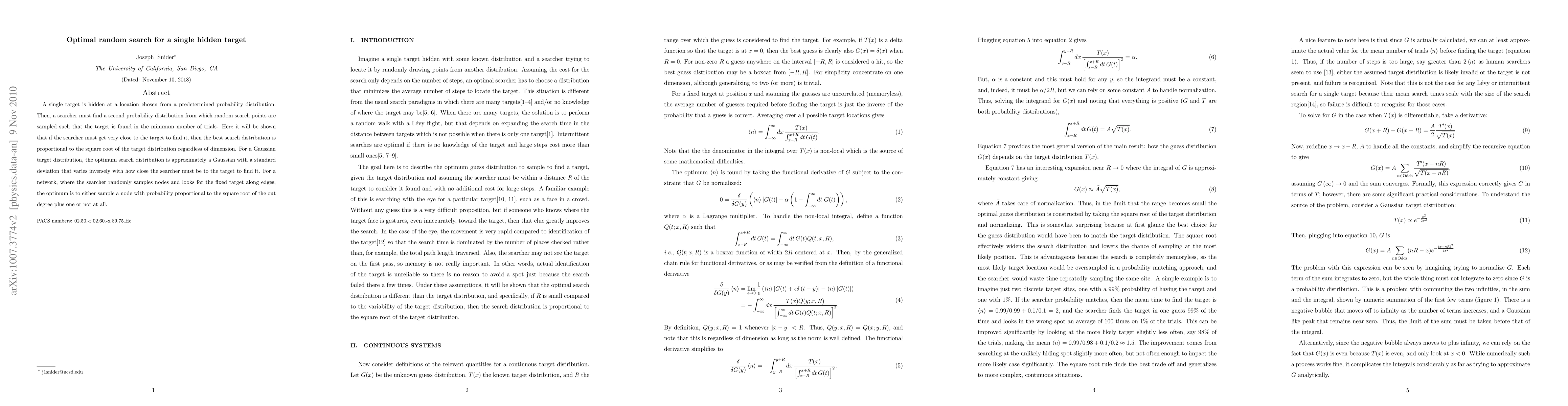 A single target is hidden at a location chosen from a predetermined probability distribution. Then, a searcher must find a second probability distribution from which random search points are sampled such that the target is found in the minimum number of trials. Here it will be shown that if the searcher must get very close to the target to find it, then the best search distribution is proportional to the square root of the target distribution. For a Gaussian target distribution, the optimum search distribution is approximately a Gaussian with a standard deviation that varies inversely with how close the searcher must be to the target to find it. For a network, where the searcher randomly samples nodes and looks for the fixed target along edges, the optimum is to either sample a node with probability proportional to the square root of the out degree plus one or not at all.