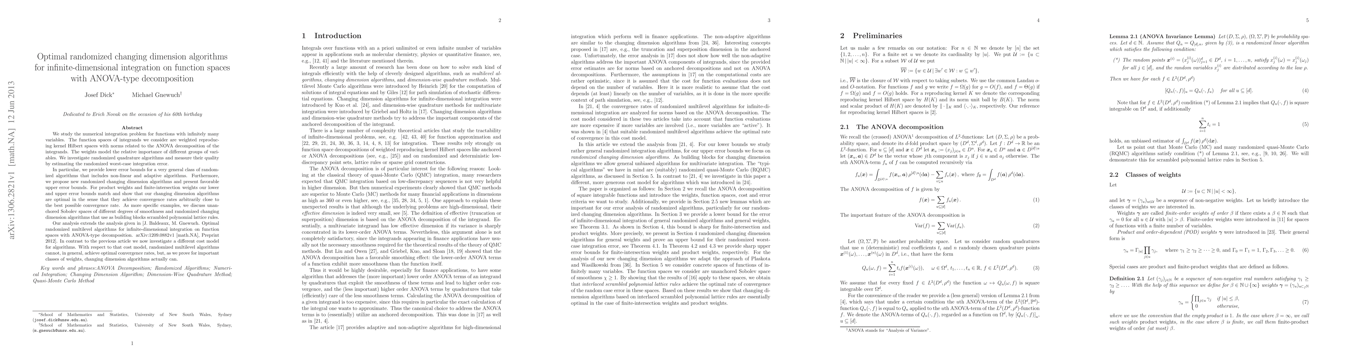 We study the numerical integration problem for functions with infinitely many variables. The function spaces of integrands we consider are weighted reproducing kernel Hilbert spaces with norms related to the ANOVA decomposition of the integrands. The weights model the relative importance of different groups of variables. We investigate randomized quadrature algorithms and measure their quality by estimating the randomized worst-case integration error. In particular, we provide lower error bounds for a very general class of randomized algorithms that includes non-linear and adaptive algorithms. Furthermore, we propose new randomized changing dimension algorithms and present favorable upper error bounds. For product weights and finite-intersection weights our lower and upper error bounds match and show that our changing dimension algorithms are optimal in the sense that they achieve convergence rates arbitrarily close to the best possible convergence rate. As more specific examples, we discuss unanchored Sobolev spaces of different degrees of smoothness and randomized changing dimension algorithms that use as building blocks scrambled polynomial lattice rules. Our analysis extends the analysis given in [J. Baldeaux, M. Gnewuch. Optimal randomized multilevel algorithms for infinite-dimensional integration on function spaces with ANOVA-type decomposition. arXiv:1209.0882v1 [math.NA], Preprint 2012]. In contrast to the previous article we now investigate a different cost model for algorithms. With respect to that cost model, randomized multilevel algorithms cannot, in general, achieve optimal convergence rates, but, as we prove for important classes of weights, changing dimension algorithms actually can.