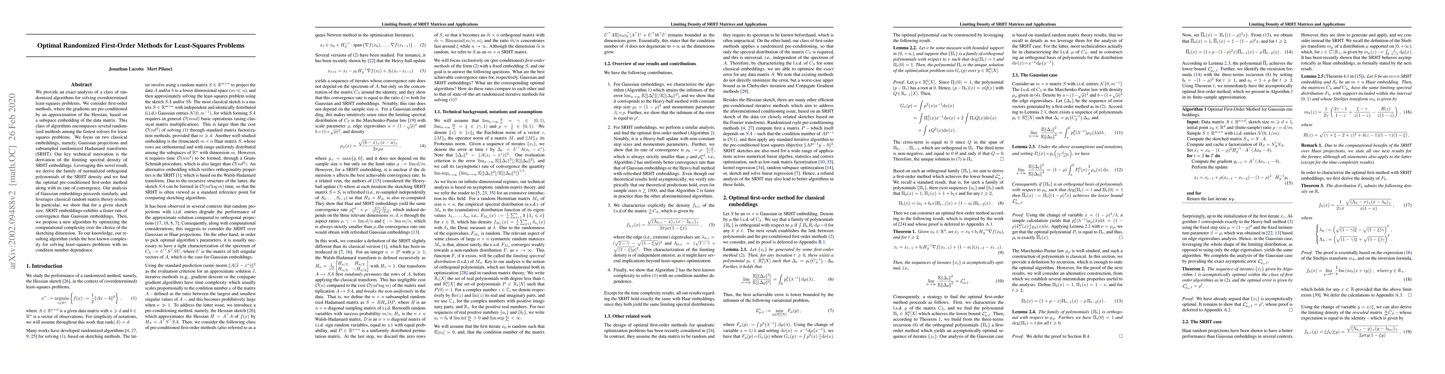 This paper analyzes randomized first-order methods for least-squares problems, focusing on Gaussian projections and SRHT embeddings. The authors derive optimal pre-conditioned first-order methods and show that SRHT embeddings achieve faster convergence rates than Gaussian projections, leading to a new algorithm with the best known complexity for least-squares problems.