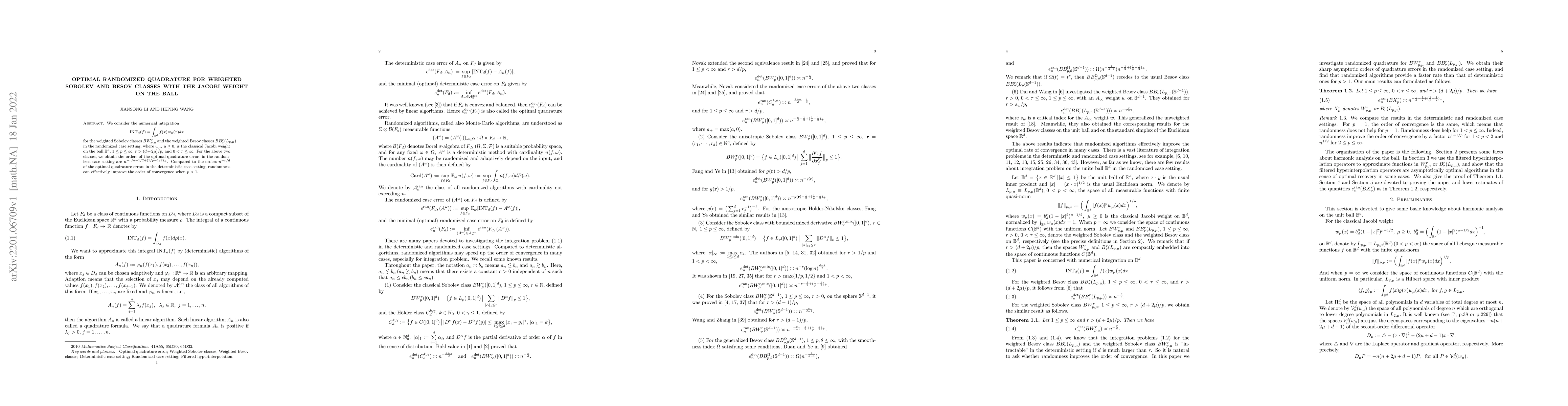 This paper investigates optimal randomized quadrature for numerical integration of functions in weighted Sobolev and Besov classes with the Jacobi weight on the ball. It finds that randomness improves the convergence rate from $n^{-r/d}$ to $n^{-r/d-1/2+(1/p-1/2)_+}$ in the randomized setting, especially when $p>1$.