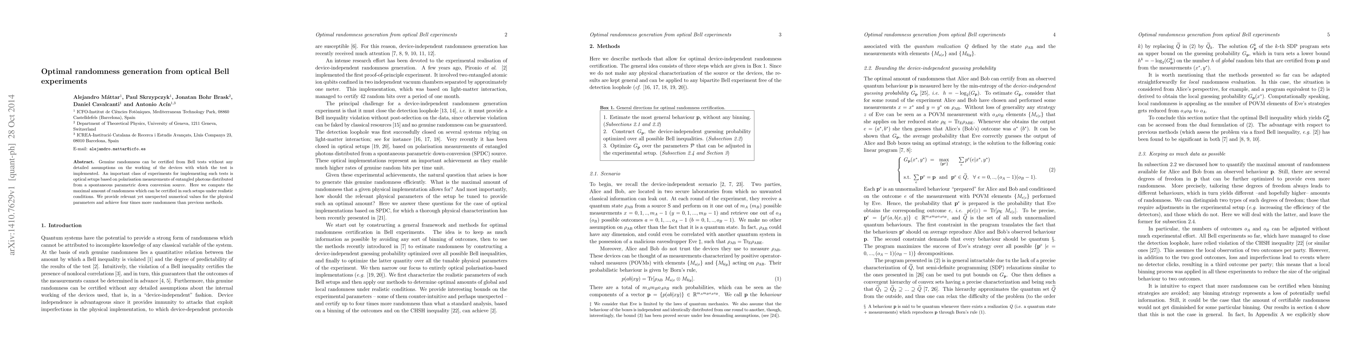 This paper certifies genuine randomness from optical Bell experiments using entangled photons, achieving four times more randomness than previous methods by computing the maximal randomness under realistic conditions. The study provides unexpected numerical values for the physical parameters involved.