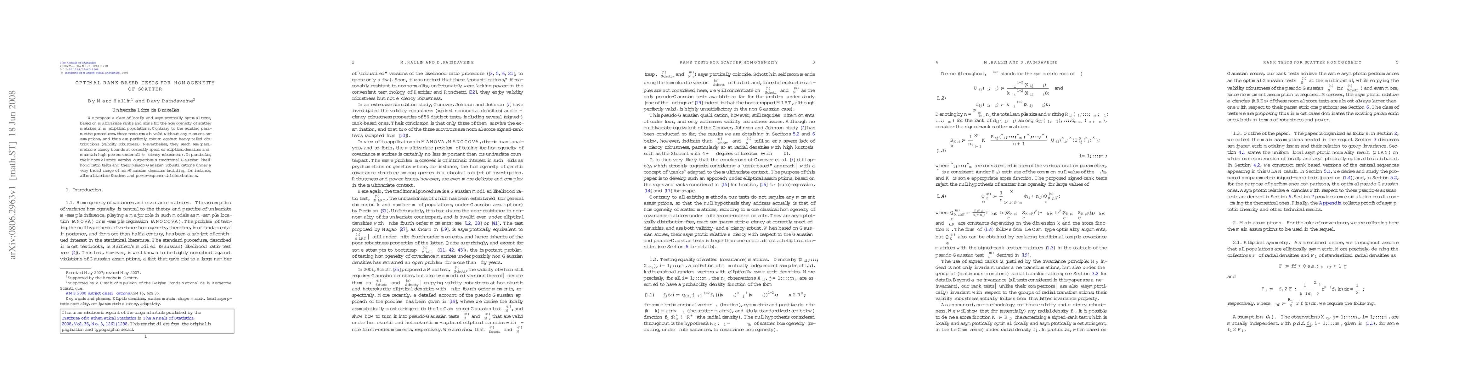 This paper introduces optimal rank-based tests for assessing the homogeneity of scatter matrices in elliptical populations, offering robustness without moment assumptions and achieving semiparametric efficiency under correct elliptical specifications. The proposed tests outperform traditional Gaussian likelihood ratio tests across a wide range of non-Gaussian distributions.