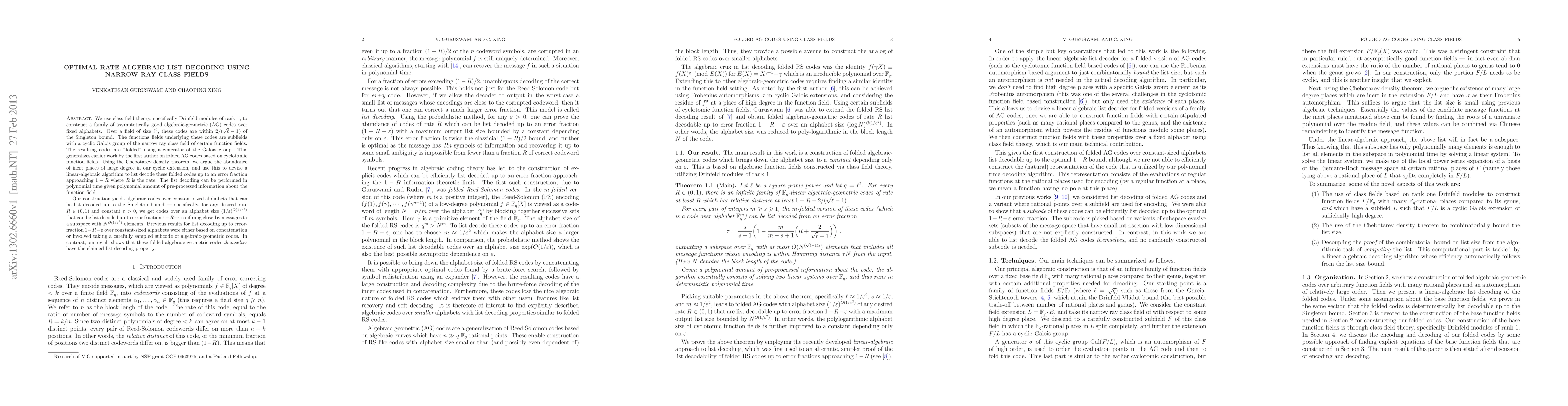 This paper constructs asymptotically good algebraic-geometric codes using narrow ray class fields and Drinfeld modules, achieving near-Singleton bound performance. It presents a polynomial-time list decoding algorithm that works for error fractions approaching $1-R$, where $R$ is the rate, and demonstrates that these codes can be list decoded without concatenation or subcode sampling.