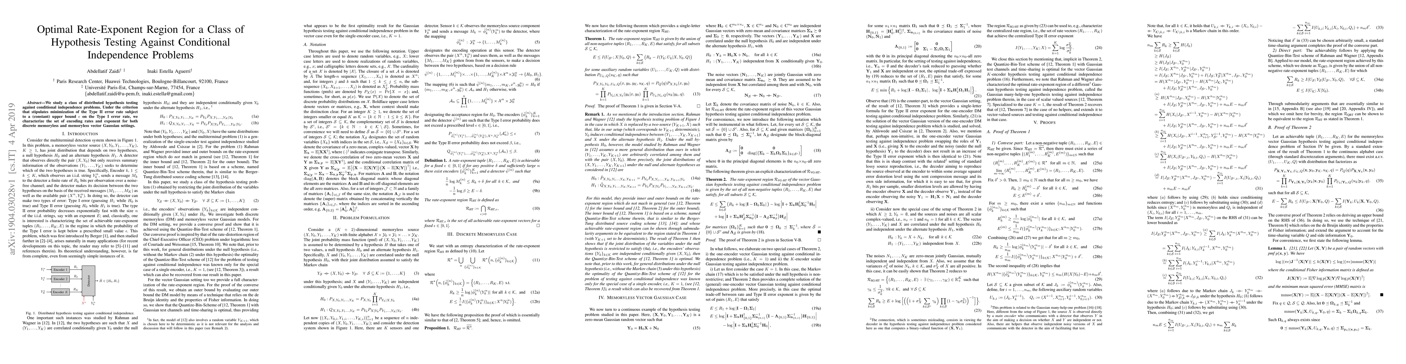 This paper studies how to minimize Type II errors in hypothesis testing while keeping Type I errors under a certain threshold. It finds the optimal rate-exponent region for this task in both discrete memoryless and vector Gaussian settings.