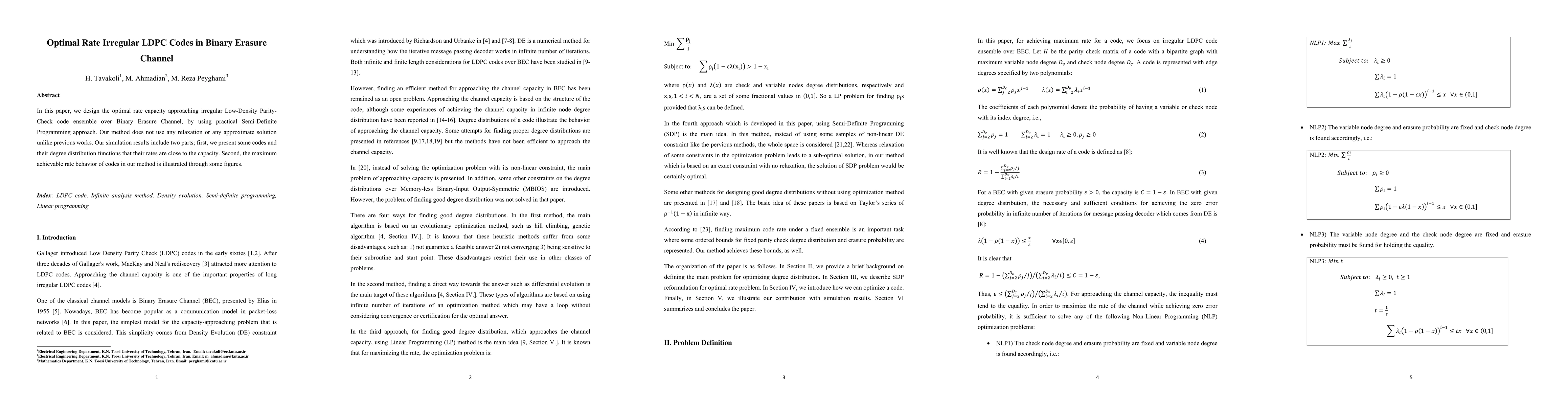 This paper designs optimal rate capacity approaching irregular Low-Density Parity-Check codes for the Binary Erasure Channel using a practical Semi-Definite Programming approach without relaxation or approximations. Simulation results show codes with rates close to capacity and illustrate the maximum achievable rate behavior.