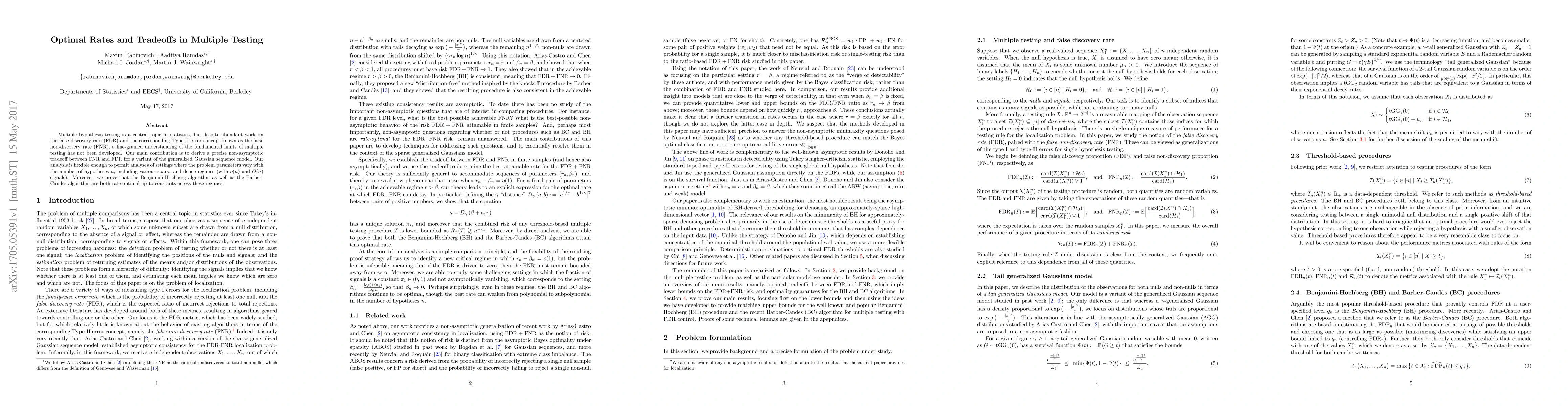 Multiple hypothesis testing is a central topic in statistics, but despite abundant work on the false discovery rate (FDR) and the corresponding Type-II error concept known as the false non-discovery rate (FNR), a fine-grained understanding of the fundamental limits of multiple testing has not been developed. Our main contribution is to derive a precise non-asymptotic tradeoff between FNR and FDR for a variant of the generalized Gaussian sequence model. Our analysis is flexible enough to permit analyses of settings where the problem parameters vary with the number of hypotheses $n$, including various sparse and dense regimes (with $o(n)$ and $\mathcal{O}(n)$ signals). Moreover, we prove that the Benjamini-Hochberg algorithm as well as the Barber-Cand\`{e}s algorithm are both rate-optimal up to constants across these regimes.