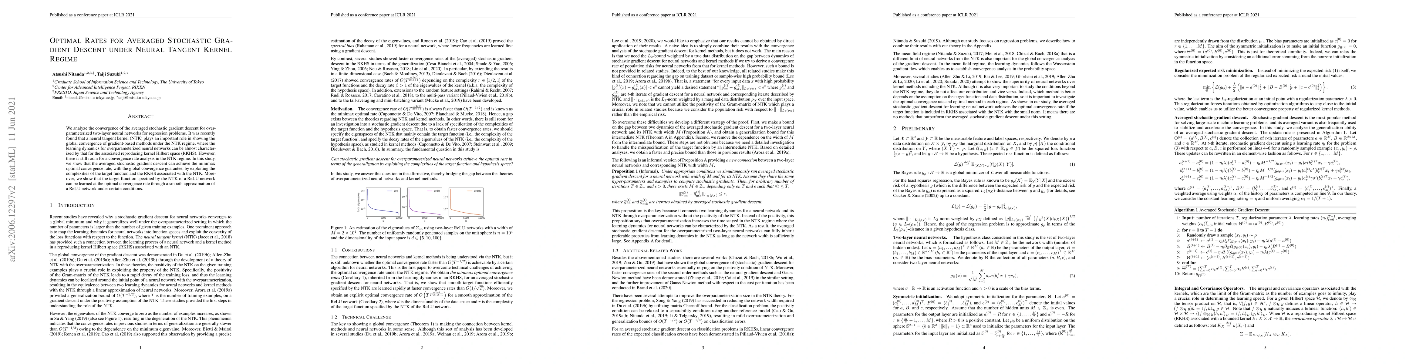This paper analyzes the convergence of averaged stochastic gradient descent for overparameterized neural networks under the neural tangent kernel regime, demonstrating that it achieves minimax optimal convergence rates and global convergence, leveraging the properties of the associated reproducing kernel Hilbert space. It also shows that ReLU networks can be optimally learned through smooth approximations under specific conditions.