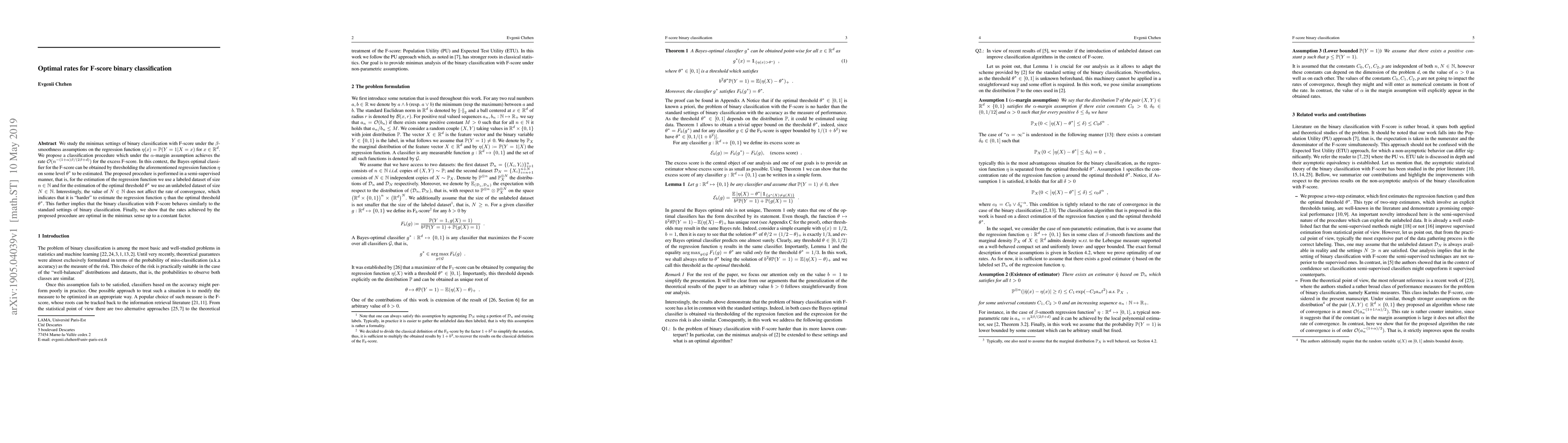 This paper proposes an optimal procedure for binary classification with F-score under a new minimax setting, achieving a rate of $O(n^{-(1+eta)eta/(2eta+d)})$ for excess F-score. The proposed method is semi-supervised and shows that estimating the regression function and threshold are easier than each other.