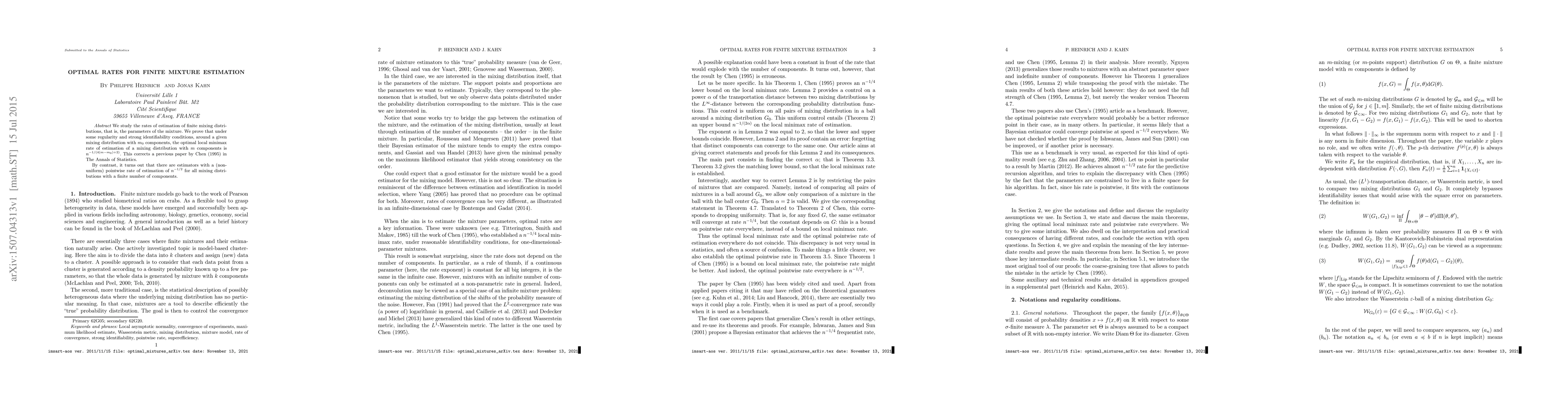 Researchers found that estimating parameters of a finite mixture distribution can achieve an optimal rate of $n^{-1/(4(m-m_0) + 2)}$, correcting previous work, and also discovered pointwise rates of estimation as low as $n^{-1/2}$ for all mixing distributions with multiple components.