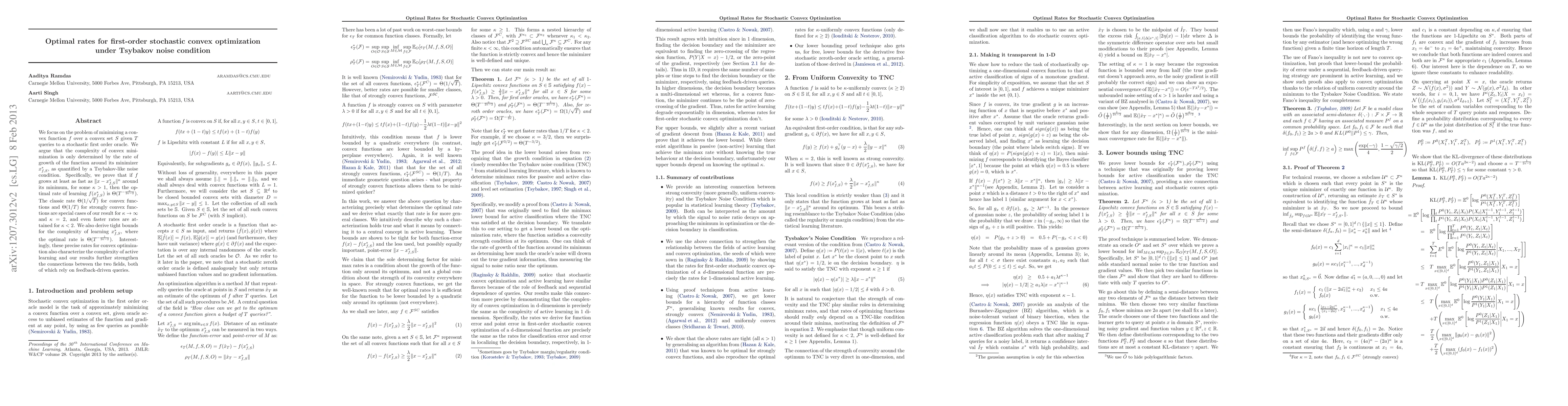 This paper investigates optimal learning rates for minimizing convex functions under Tsybakov noise conditions using stochastic first-order optimization. It demonstrates that the learning rate depends on the function's growth rate around its minimum, providing tighter bounds than traditional rates for convex and strongly convex functions.