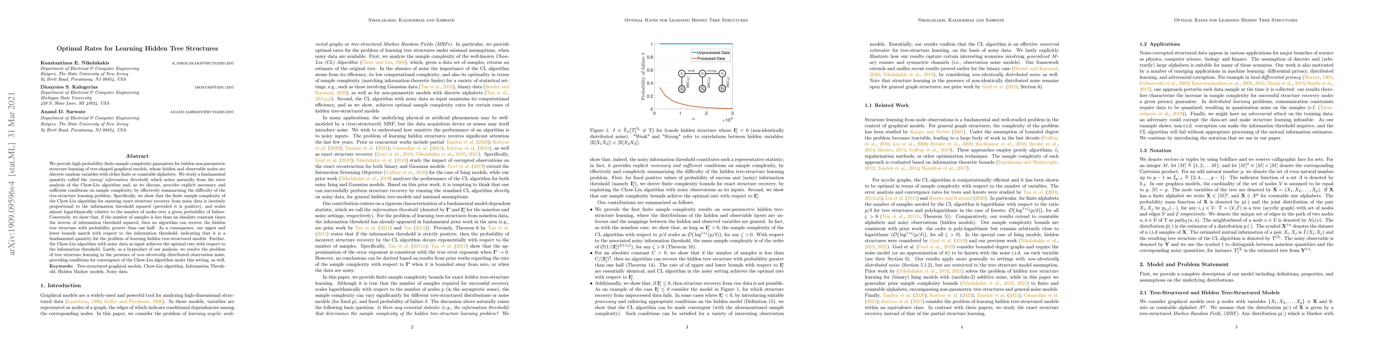 This paper establishes optimal finite sample complexity bounds for learning hidden tree structures using the Chow-Liu algorithm, demonstrating that the algorithm's performance is inversely proportional to the information threshold squared. The study shows that the Chow-Liu algorithm achieves the optimal rate for structure recovery, and resolves the problem of learning under non-identically distributed noise.