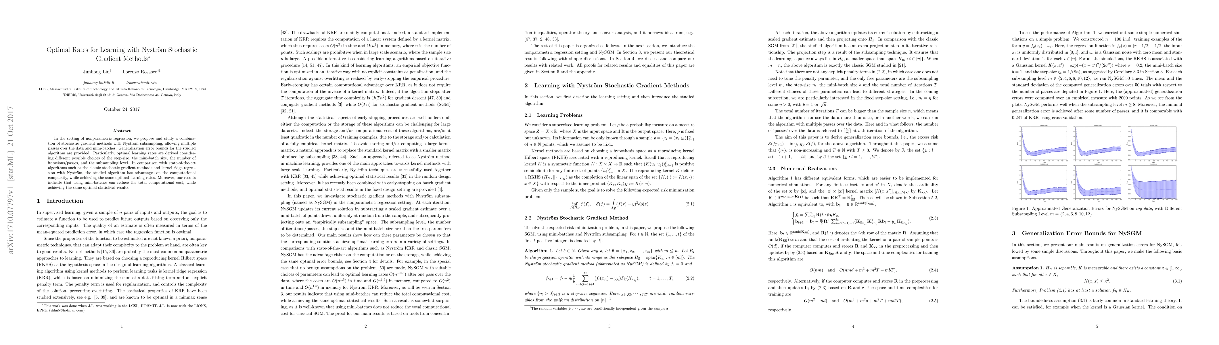 This paper proposes a combination of stochastic gradient methods with Nyström subsampling for nonparametric regression, achieving optimal learning rates. The algorithm offers computational efficiency advantages over state-of-the-art methods while maintaining optimal statistical performance, especially when using mini-batches.