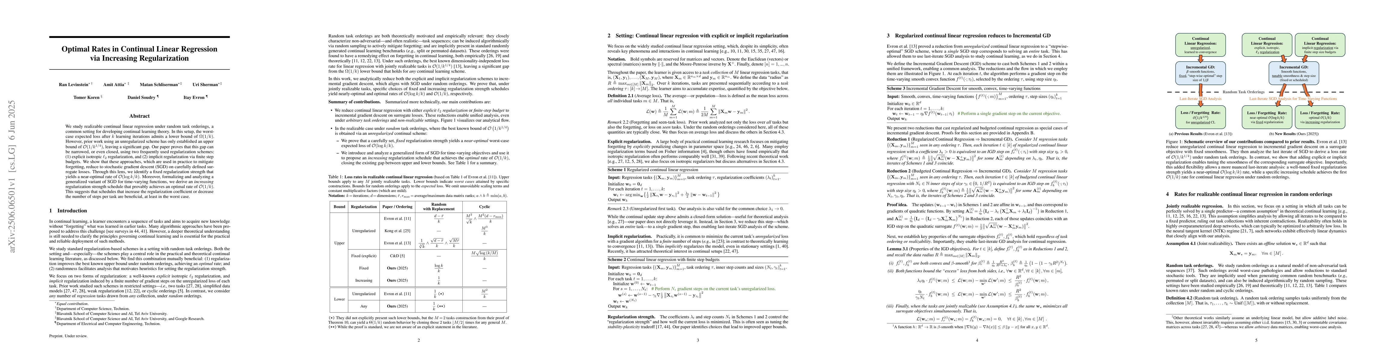 This paper shows that two commonly used regularization schemes can help continual linear regression achieve a near-optimal rate of $O(rac{ ext{log k}}{k})$ or even $O(1/k)$ by increasing the strength of regularization.