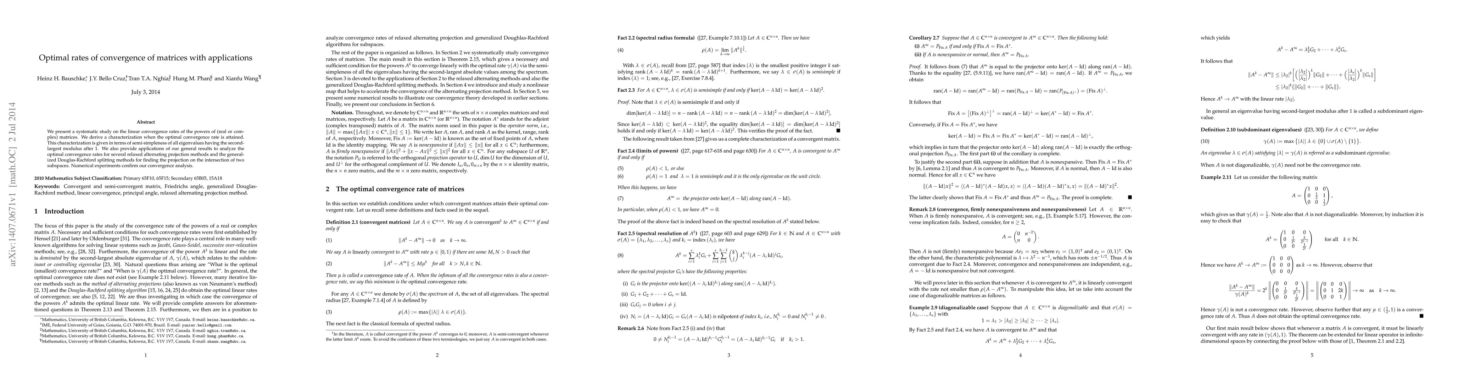 This paper investigates the linear convergence rates of matrix powers, identifying conditions under which optimal convergence is achieved, specifically when all eigenvalues with the second-largest modulus are semi-simple. It applies these findings to analyze convergence in alternating projection methods and generalized Douglas-Rachford splitting methods, supported by numerical experiments.