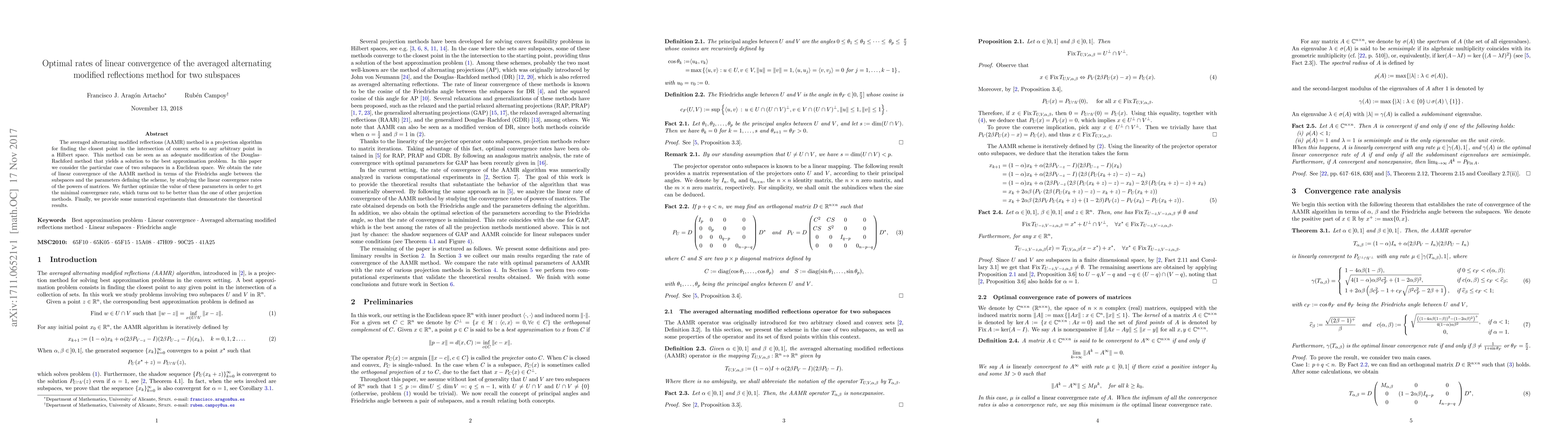 The averaged alternating modified reflections (AAMR) method is a projection algorithm for finding the closest point in the intersection of convex sets to any arbitrary point in a Hilbert space. This method can be seen as an adequate modification of the Douglas--Rachford method that yields a solution to the best approximation problem. In this paper we consider the particular case of two subspaces in a Euclidean space. We obtain the rate of linear convergence of the AAMR method in terms of the Friedrichs angle between the subspaces and the parameters defining the scheme, by studying the linear convergence rates of the powers of matrices. We further optimize the value of these parameters in order to get the minimal convergence rate, which turns out to be better than the one of other projection methods. Finally, we provide some numerical experiments that demonstrate the theoretical results.
