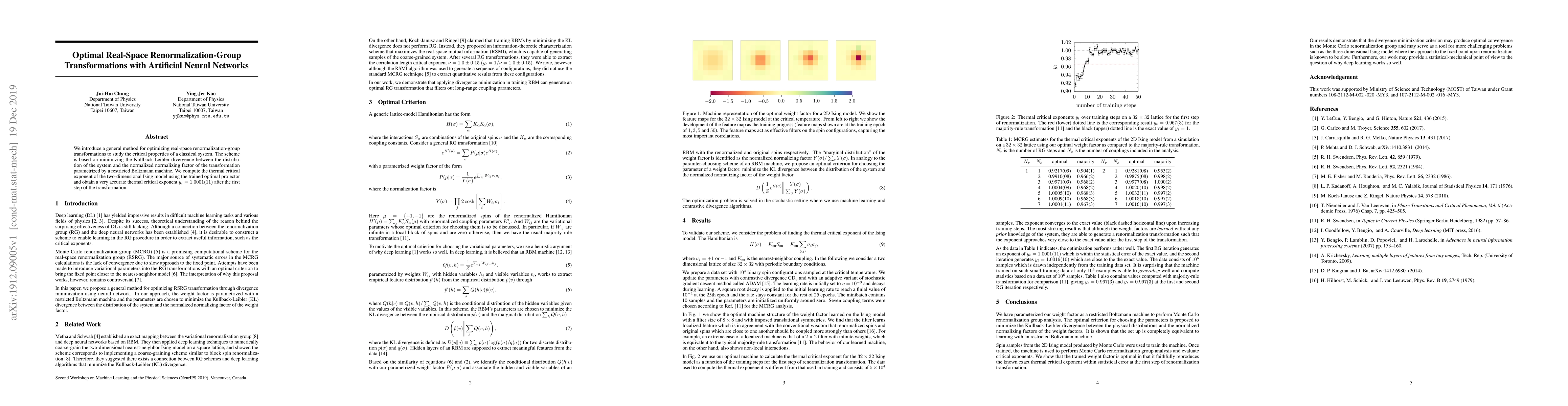 We introduce a general method for optimizing real-space renormalization-group transformations to study the critical properties of a classical system. The scheme is based on minimizing the Kullback-Leibler divergence between the distribution of the system and the normalized normalizing factor of the transformation parametrized by a restricted Boltzmann machine. We compute the thermal critical exponent of the two-dimensional Ising model using the trained optimal projector and obtain a very accurate thermal critical exponent $y_t=1.0001(11)$ after the first step of the transformation.