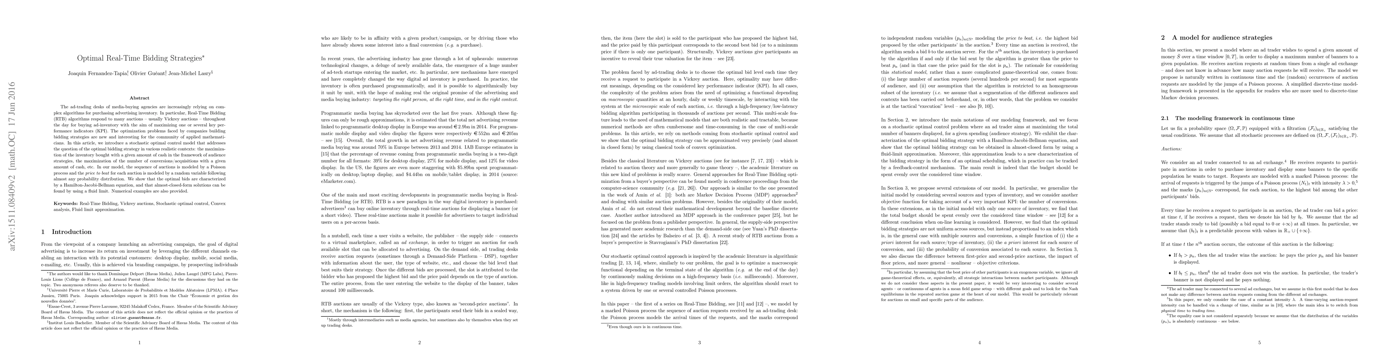 The ad-trading desks of media-buying agencies are increasingly relying on complex algorithms for purchasing advertising inventory. In particular, Real-Time Bidding (RTB) algorithms respond to many auctions -- usually Vickrey auctions -- throughout the day for buying ad-inventory with the aim of maximizing one or several key performance indicators (KPI). The optimization problems faced by companies building bidding strategies are new and interesting for the community of applied mathematicians. In this article, we introduce a stochastic optimal control model that addresses the question of the optimal bidding strategy in various realistic contexts: the maximization of the inventory bought with a given amount of cash in the framework of audience strategies, the maximization of the number of conversions/acquisitions with a given amount of cash, etc. In our model, the sequence of auctions is modeled by a Poisson process and the \textit{price to beat} for each auction is modeled by a random variable following almost any probability distribution. We show that the optimal bids are characterized by a Hamilton-Jacobi-Bellman equation, and that almost-closed form solutions can be found by using a fluid limit. Numerical examples are also carried out.