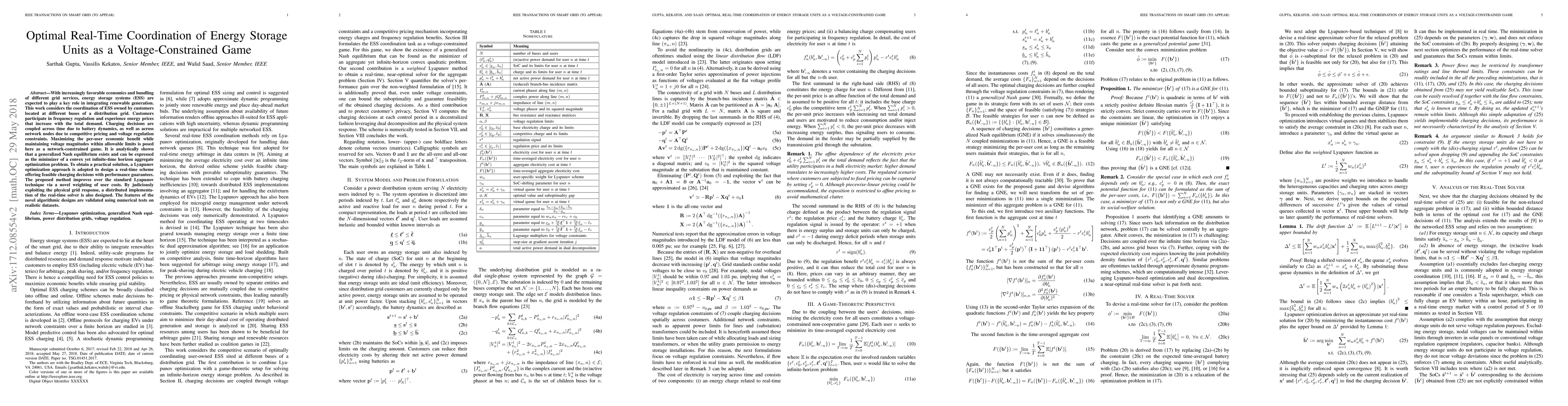 This paper proposes a real-time coordination strategy for energy storage units (ESS) in a distribution grid, framed as a voltage-constrained game. It employs a Lyapunov optimization approach to achieve a generalized Nash equilibrium, ensuring economic benefits while maintaining voltage limits, and validates the method through numerical simulations.