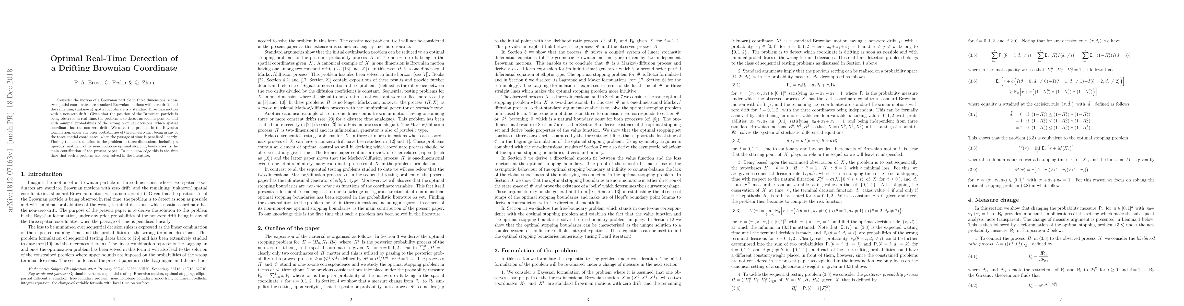 Consider the motion of a Brownian particle in three dimensions, whose two spatial coordinates are standard Brownian motions with zero drift, and the remaining (unknown) spatial coordinate is a standard Brownian motion with a non-zero drift. Given that the position of the Brownian particle is being observed in real time, the problem is to detect as soon as possible and with minimal probabilities of the wrong terminal decisions, which spatial coordinate has the non-zero drift. We solve this problem in the Bayesian formulation, under any prior probabilities of the non-zero drift being in any of the three spatial coordinates, when the passage of time is penalised linearly. Finding the exact solution to the problem in three dimensions, including a rigorous treatment of its non-monotone optimal stopping boundaries, is the main contribution of the present paper. To our knowledge this is the first time that such a problem has been solved in the literature.