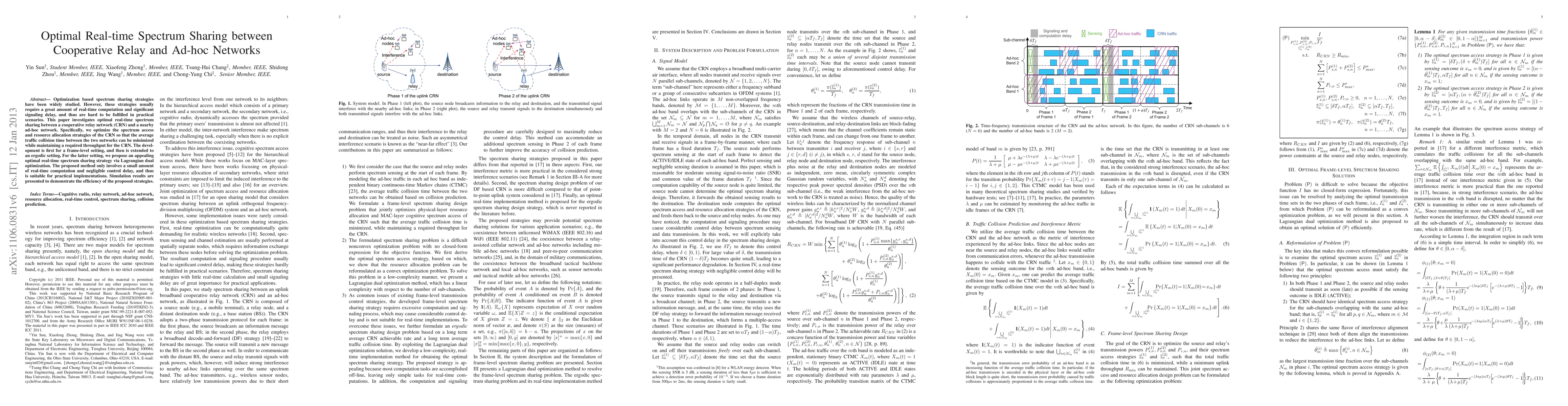 This paper proposes optimal real-time spectrum sharing strategies for cooperative relay networks (CRN) and ad-hoc networks, minimizing traffic collision time with minimal real-time computation and control delay. The method is demonstrated via Lagrangian dual optimization and validated through simulations.
