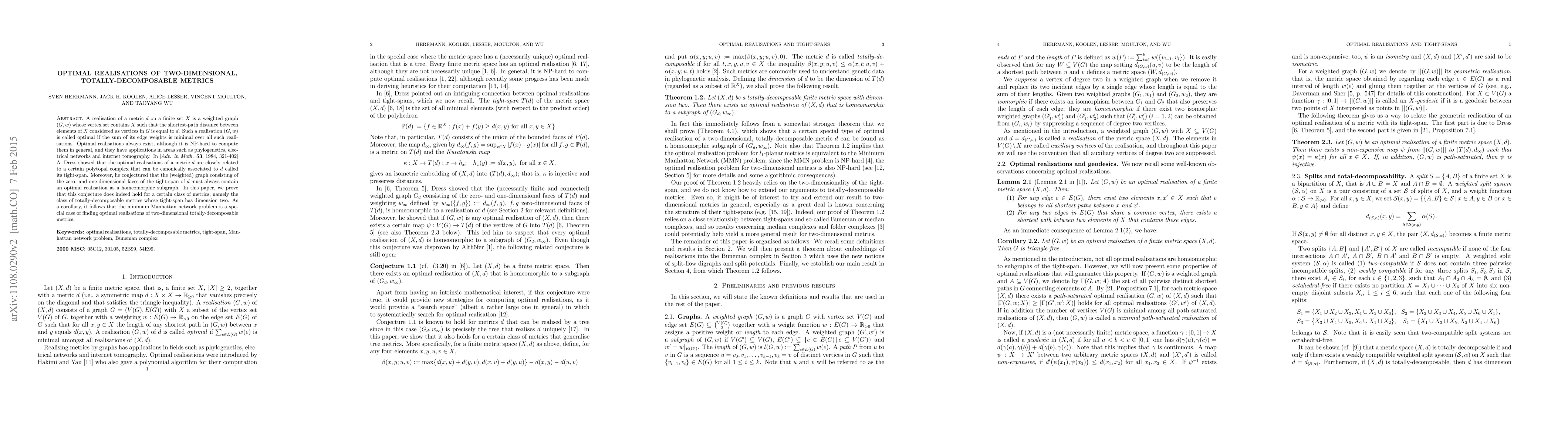A realisation of a metric $d$ on a finite set $X$ is a weighted graph $(G,w)$ whose vertex set contains $X$ such that the shortest-path distance between elements of $X$ considered as vertices in $G$ is equal to $d$. Such a realisation $(G,w)$ is called optimal if the sum of its edge weights is minimal over all such realisations. Optimal realisations always exist, although it is NP-hard to compute them in general, and they have applications in areas such as phylogenetics, electrical networks and internet tomography. In [Adv. in Math. 53, 1984, 321-402] A.~Dress showed that the optimal realisations of a metric $d$ are closely related to a certain polytopal complex that can be canonically associated to $d$ called its tight-span. Moreover, he conjectured that the (weighted) graph consisting of the zero- and one-dimensional faces of the tight-span of $d$ must always contain an optimal realisation as a homeomorphic subgraph. In this paper, we prove that this conjecture does indeed hold for a certain class of metrics, namely the class of totally"=decomposable metrics whose tight-span has dimension two. As a corollary, it follows that the minimum Manhattan network problem is a special case of finding optimal realisations of two-dimensional totally-decomposable metrics.