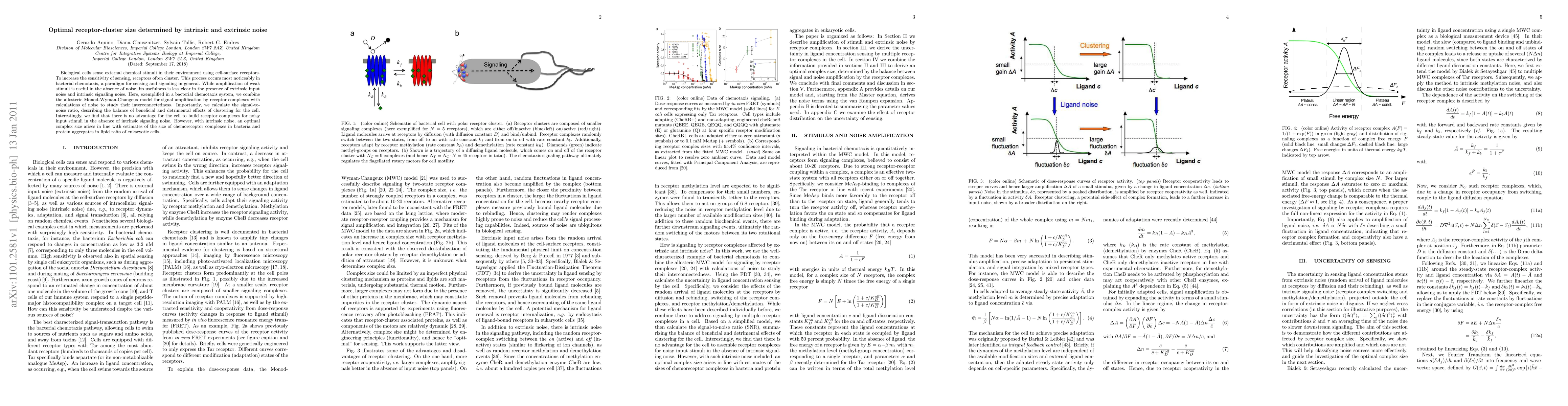 This paper investigates the optimal size of receptor clusters in bacterial chemotaxis, balancing signal amplification against noise. It finds that receptor clustering is not beneficial for noisy inputs without intrinsic signaling noise, but an optimal cluster size emerges when intrinsic noise is present.