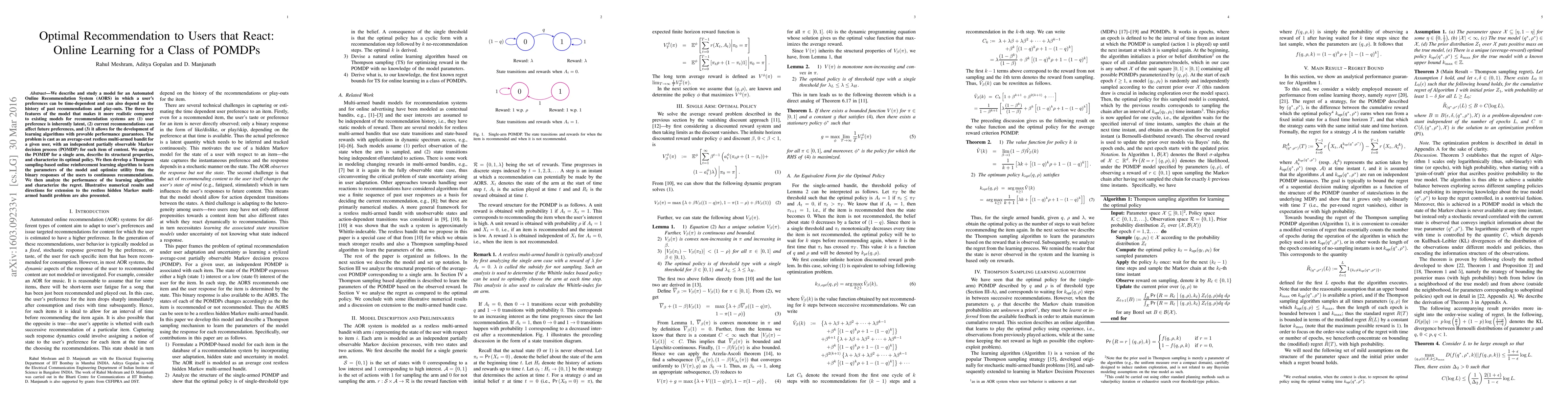 This paper proposes an advanced online recommendation system model based on POMDPs, where user preferences evolve over time and are influenced by past interactions. It introduces a Thompson sampling-based reinforcement learning algorithm to optimize recommendations, analyzes its performance, and discusses potential extensions to broader bandit problems.