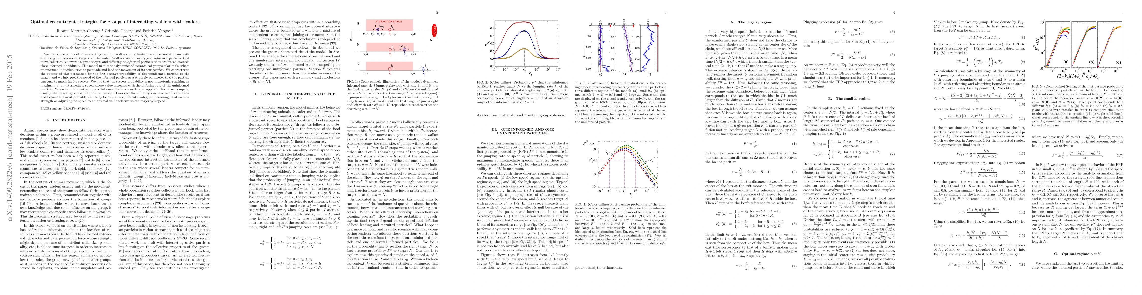 We introduce a model of interacting random walkers on a finite one dimensional chain with absorbing boundaries or targets at the ends. Walkers are of two types: informed particles that move ballistically towards a given target, and diffusing uninformed particles that are biased towards close informed particles. This model mimics the dynamics of hierarchical groups of animals, where an informed individual tries to persuade and lead the movement of its conspecifics. We characterize the success of the persuasion by the first-passage probability of the uninformed particle to the target, and we interpret the speed of the informed particle as a strategic parameter that the particle tunes to maximize its success. We find that the success probability is non-monotonic, reaching its maximum at an intermediate speed whose value increases with the diffusing rate of the uninformed particle. When two different groups of informed leaders traveling in opposite directions compete, usually the largest group is the most successful. However, the minority can reverse this situation and become the most probable winner by following two different strategies: increasing its attraction strength or adjusting its speed to an optimal value relative to the majority's speed.