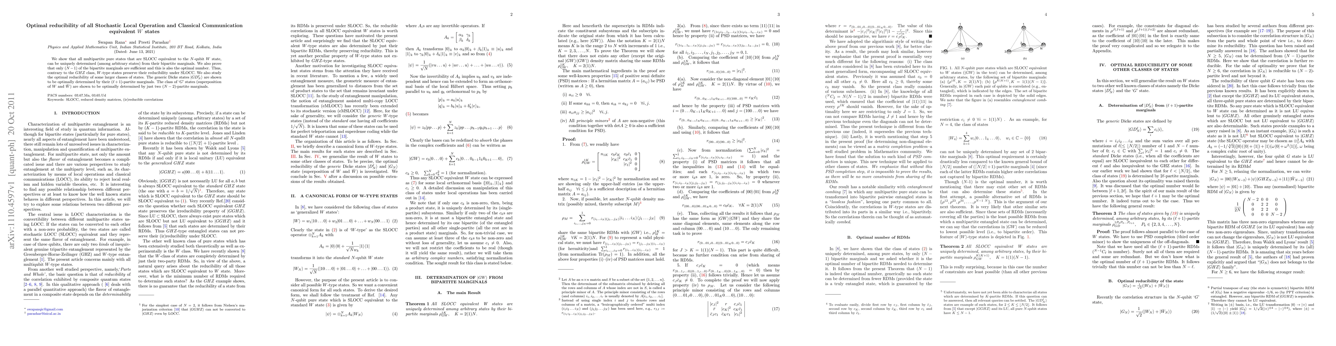 This paper demonstrates that all $N$-qubit $W$ states equivalent under Stochastic Local Operation and Classical Communication (SLOCC) can be uniquely identified by their bipartite marginals, with only $(N-1)$ of these marginals being necessary, which is optimal. It also explores the optimal reducibility of other state classes, showing that generic Dicke states and '$G$' states require $\ell+1$ and two $(N-2)$-partite marginals, respectively.