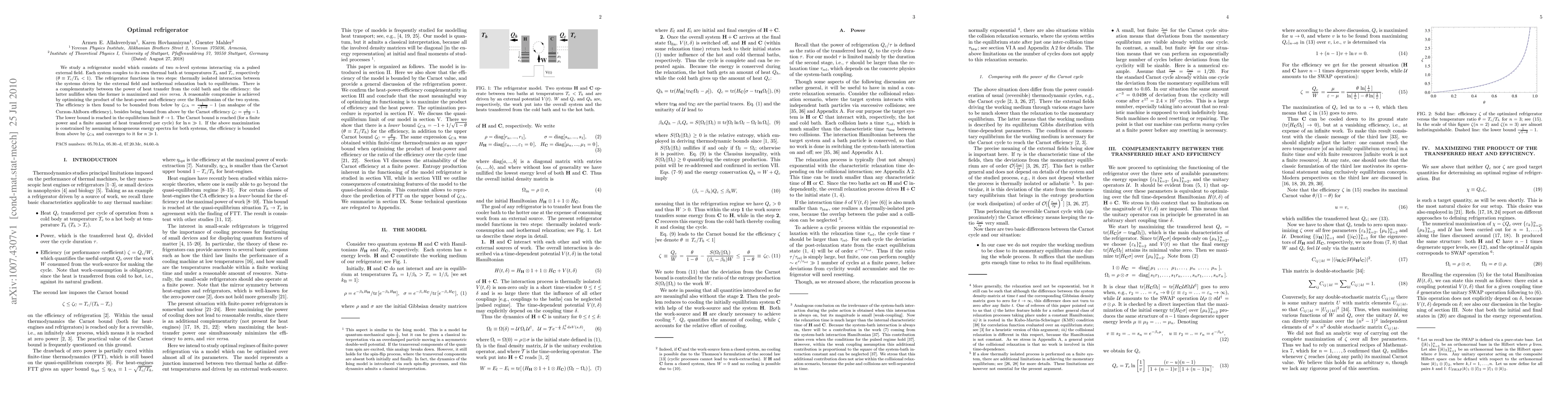 We study a refrigerator model which consists of two $n$-level systems interacting via a pulsed external field. Each system couples to its own thermal bath at temperatures $T_h$ and $T_c$, respectively ($\theta\equiv T_c/T_h<1$). The refrigerator functions in two steps: thermally isolated interaction between the systems driven by the external field and isothermal relaxation back to equilibrium. There is a complementarity between the power of heat transfer from the cold bath and the efficiency: the latter nullifies when the former is maximized and {\it vice versa}. A reasonable compromise is achieved by optimizing the product of the heat-power and efficiency over the Hamiltonian of the two system. The efficiency is then found to be bounded from below by $\zeta_{\rm CA}=\frac{1}{\sqrt{1-\theta}}-1$ (an analogue of the Curzon-Ahlborn efficiency), besides being bound from above by the Carnot efficiency $\zeta_{\rm C} = \frac{1}{1-\theta}-1$. The lower bound is reached in the equilibrium limit $\theta\to 1$. The Carnot bound is reached (for a finite power and a finite amount of heat transferred per cycle) for $\ln n\gg 1$. If the above maximization is constrained by assuming homogeneous energy spectra for both systems, the efficiency is bounded from above by $\zeta_{\rm CA}$ and converges to it for $n\gg 1$.