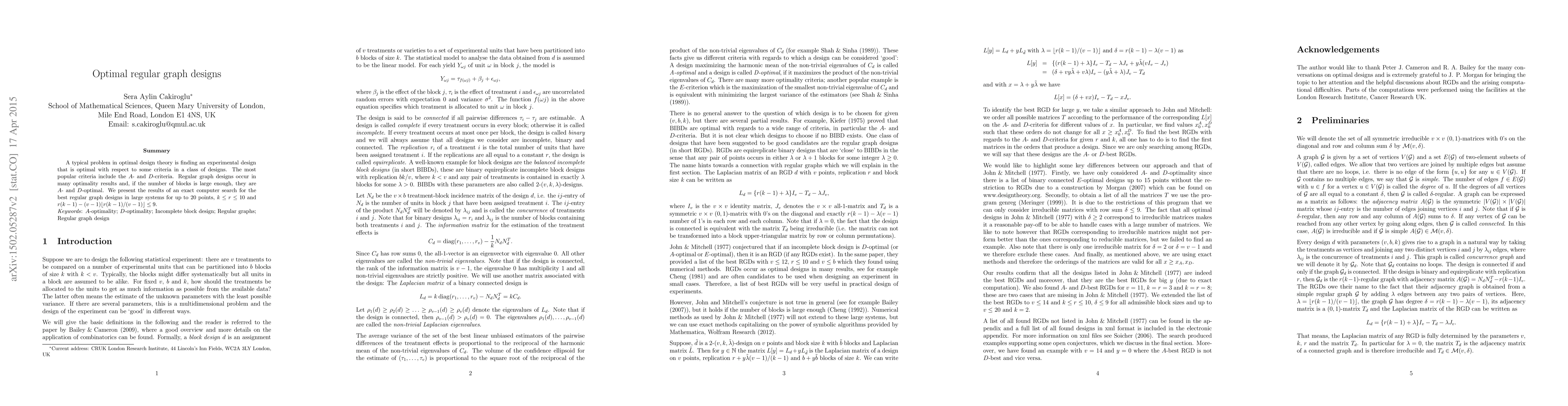 This research paper identifies optimal regular graph designs for experimental systems, finding that they can achieve A- and D-optimality in large systems with up to 20 points.
