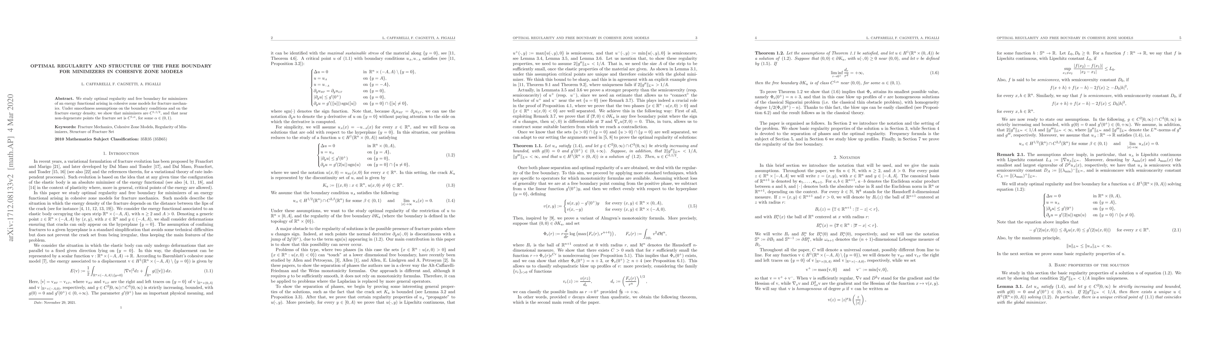 We study optimal regularity and free boundary for minimizers of an energy functional arising in cohesive zone models for fracture mechanics. Under smoothness assumptions on the boundary conditions and on the fracture energy density, we show that minimizers are $C^{1, 1/2}$, and that near non-degenerate points the fracture set is $C^{1, \alpha}$, for some $\alpha \in (0, 1)$.