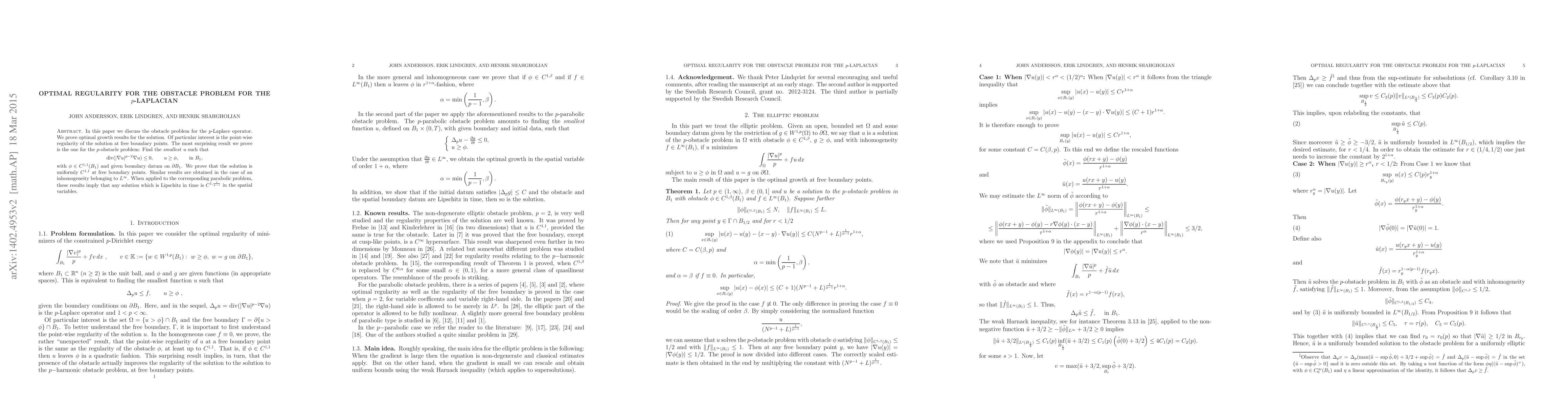 In this paper we discuss the obstacle problem for the $p$-Laplace operator. We prove optimal growth results for the solution. Of particular interest is the point-wise regularity of the solution at free boundary points. The most surprising result we prove is the one for the $p$-obstacle problem: Find the smallest $u$ such that $$ \hbox{div} (|\nabla u|^{p-2}\nabla u) \leq 0, \qquad u\geq \phi, \qquad \hbox{in } B_1, $$ with $\phi \in C^{1,1}(B_1)$ and given boundary datum on $\partial B_1$. We prove that the solution is uniformly $C^{1,1}$ at free boundary points. Similar results are obtained in the case of an inhomogeneity belonging to $L^\infty$. When applied to the corresponding parabolic problem, these results imply that any solution which is Lipschitz in time is $C^{1,\frac{1}{p-1}}$ in the spatial variables.