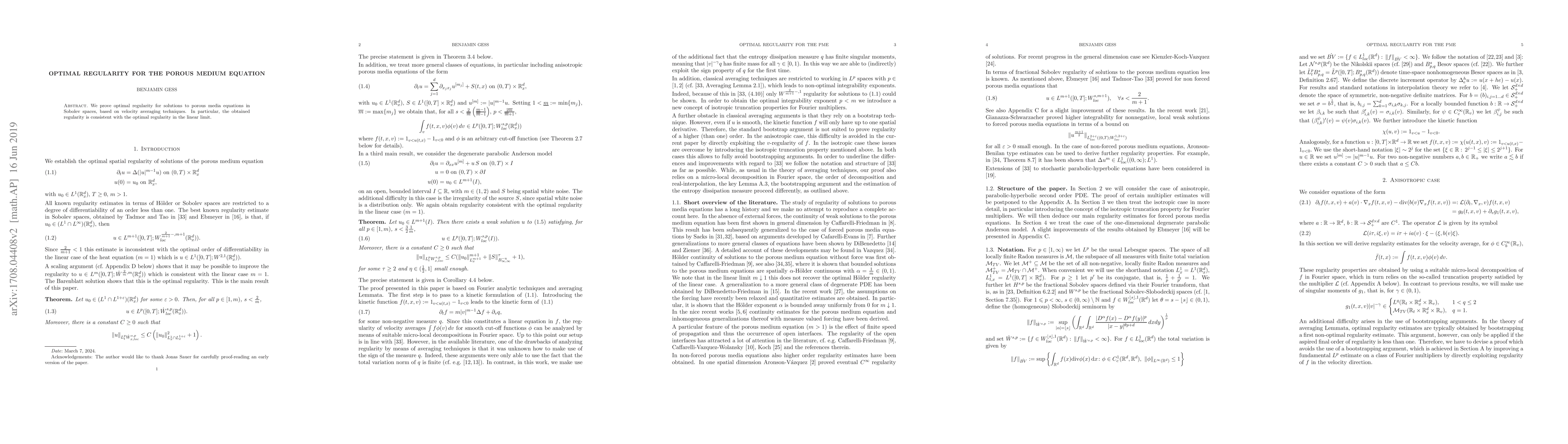 We prove optimal regularity for solutions to porous media equations in Sobolev spaces, based on velocity averaging techniques. In particular, the obtained regularity is consistent with the optimal regularity in the linear limit.