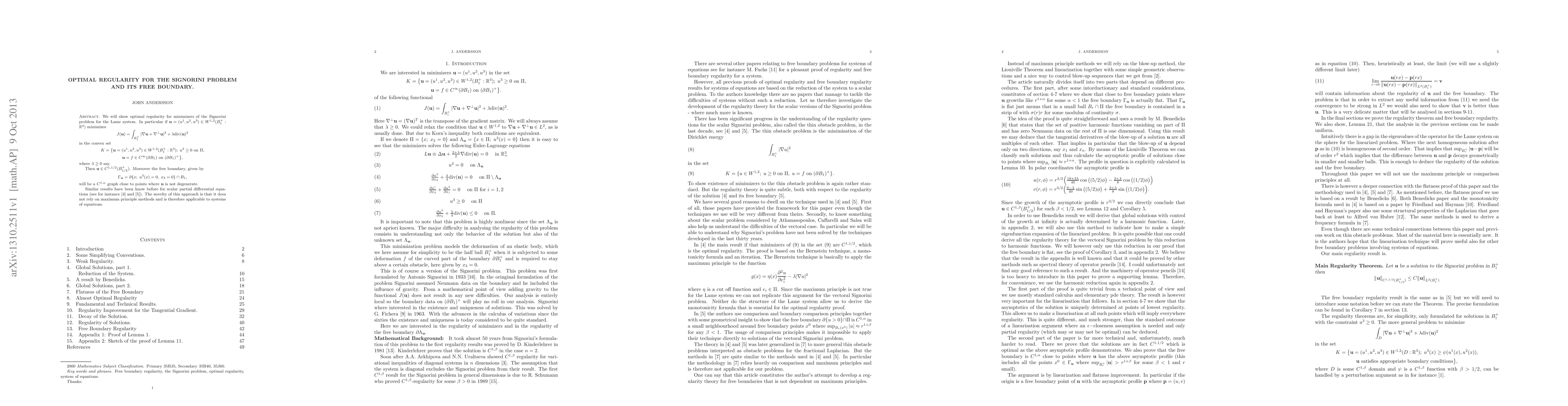 This paper establishes optimal regularity for minimizers of the Signorini problem, a system of partial differential equations, proving that the solution is in $C^{1,1/2}(B_{1/2}^+)$ with a smooth free boundary.