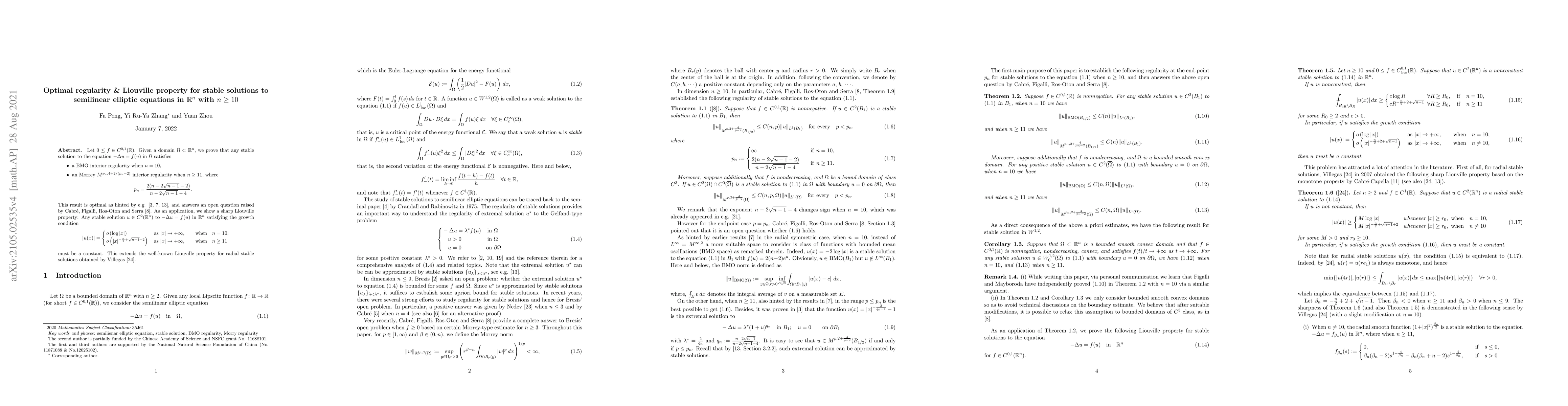 Research proves that stable solutions to semilinear elliptic equations in high dimensions (n>=10) exhibit optimal regularity properties, including BMO and Morrey norms, and have a sharp Liouville property for certain growth conditions.