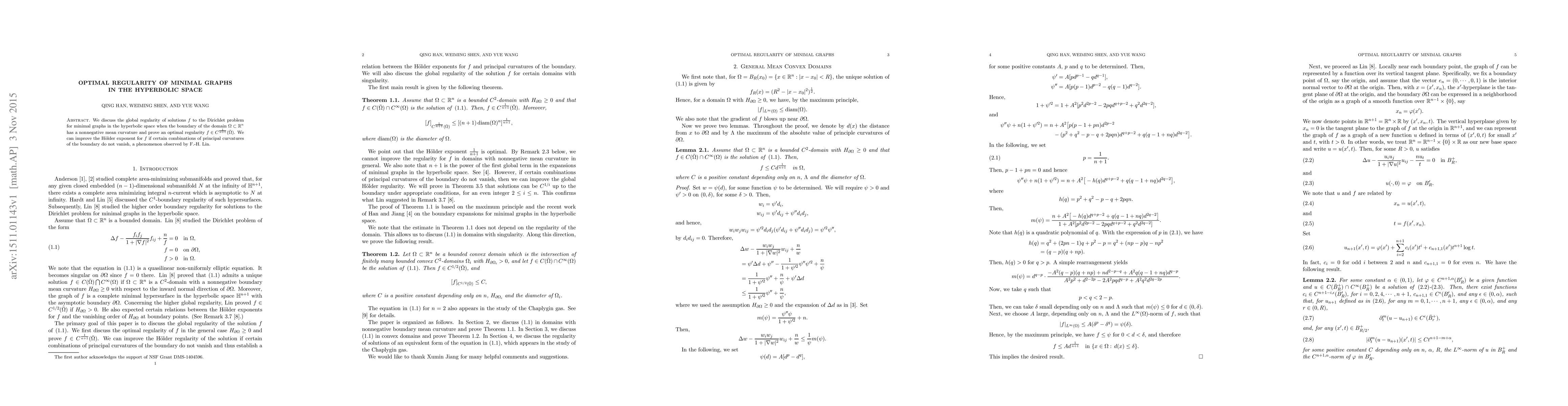 We discuss the global regularity of solutions $f$ to the Dirichlet problem for minimal graphs in the hyperbolic space when the boundary of the domain $\Omega\subset\mathbb R^n$ has a nonnegative mean curvature and prove an optimal regularity $f\in C^{\frac{1}{n+1}}(\bar{\Omega})$. We can improve the H\"older exponent for $f$ if certain combinations of principal curvatures of the boundary do not vanish, a phenomenon observed by F.-H. Lin.