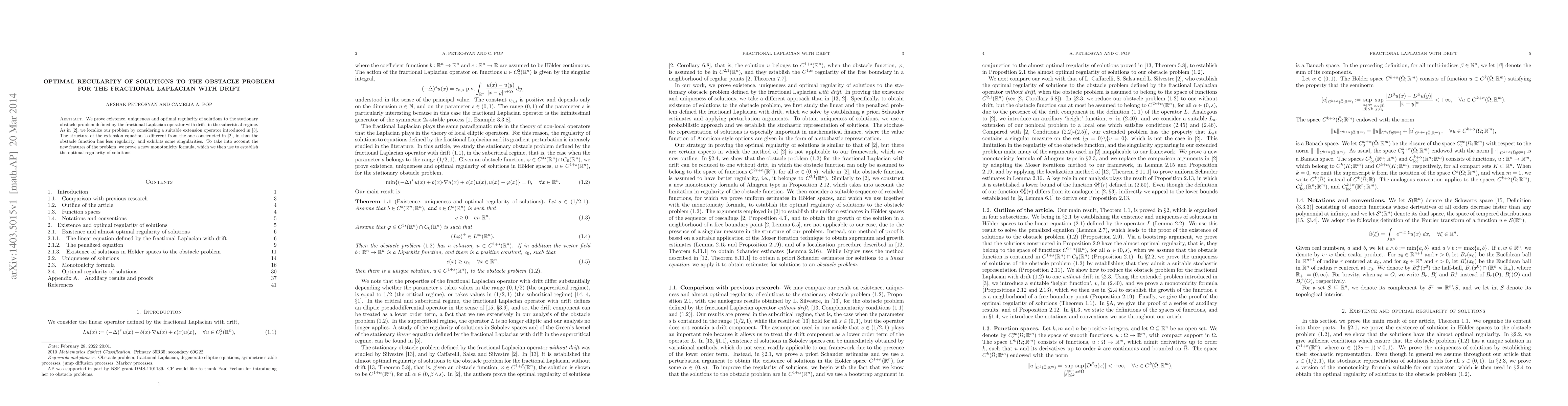 This paper proves the existence, uniqueness, and optimal regularity of solutions to the obstacle problem involving the fractional Laplacian with drift, utilizing a new Almgren-type monotonicity formula to address the problem's unique features. The study localizes the problem using an extension operator, differing from previous work on the fractional Laplacian without drift.