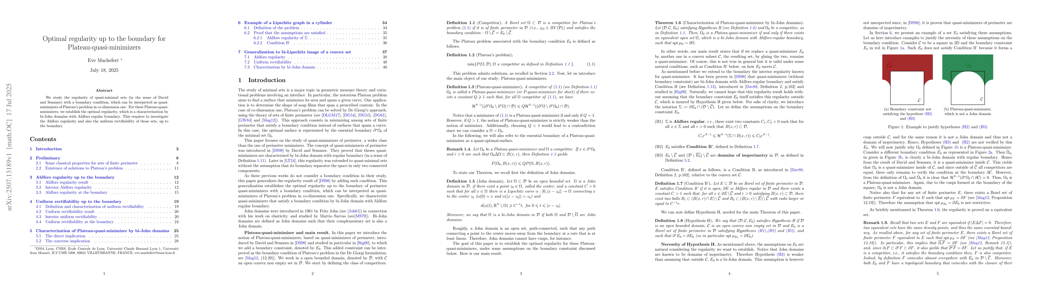 We study the regularity of quasi-minimal sets (in the sense of David and Semmes) with a boundary condition, which can be interpreted as quasi-minimizers of Plateau's problem in co-dimension one. For these Plateau-quasi-minimizers, we establish the optimal regularity, which is a characterization by bi-John domains with Ahlfors regular boundaries. This requires to investigate the Ahlfors regularity and also the uniform rectifiability of those sets, up to the boundary.