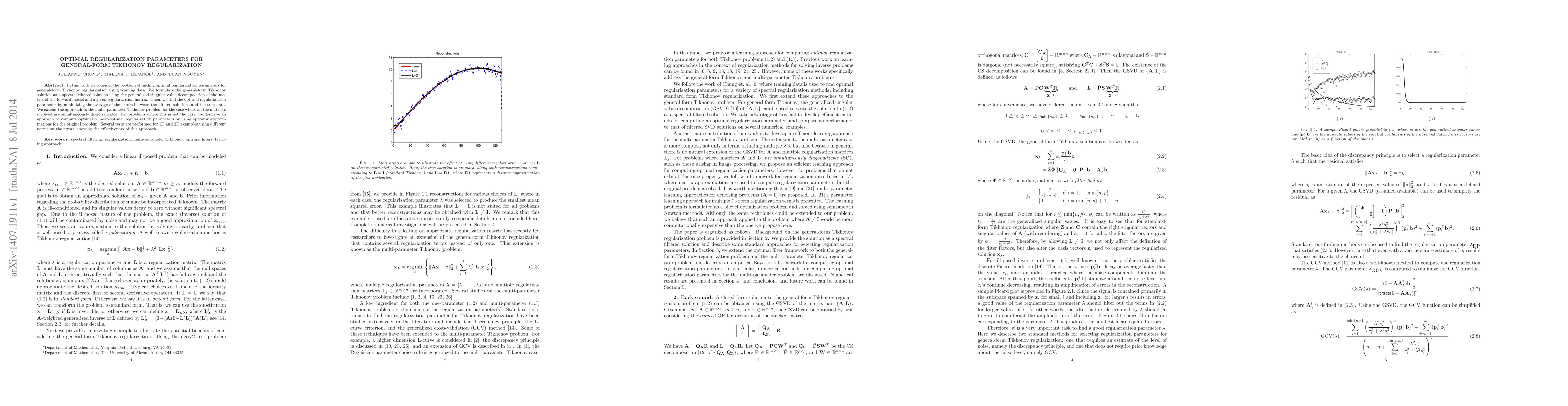 This paper develops methods to determine optimal regularization parameters for general-form Tikhonov regularization, employing training data and generalized singular value decomposition. It extends the approach to multi-parameter cases and provides effective solutions for non-diagonalizable matrices through operator approximations, validated by tests on 1D and 2D examples.