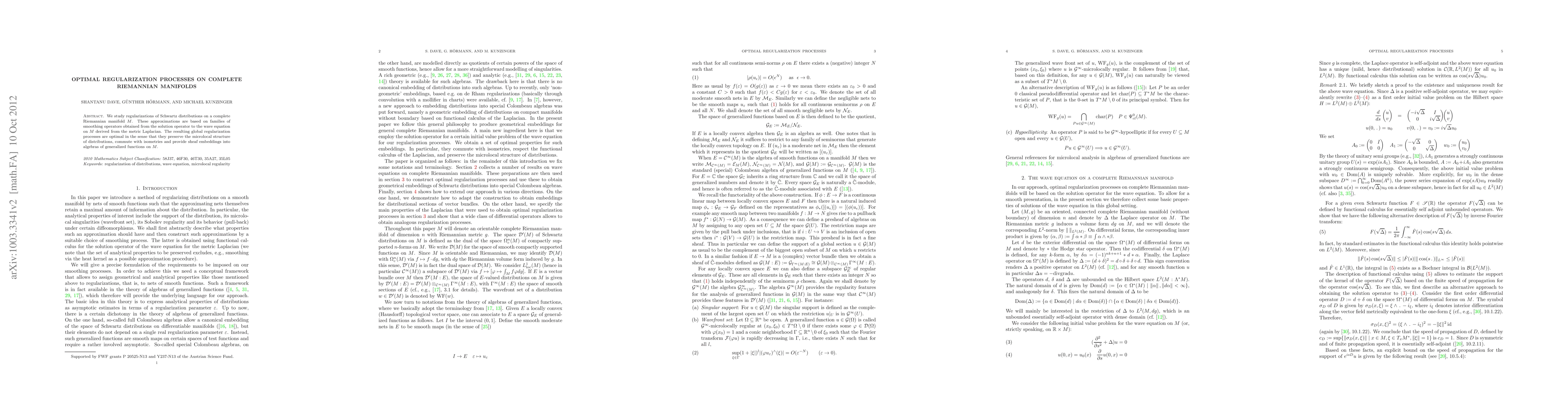 We study regularizations of Schwartz distributions on a complete Riemannian manifold $M$. These approximations are based on families of smoothing operators obtained from the solution operator to the wave equation on $M$ derived from the metric Laplacian. The resulting global regularization processes are optimal in the sense that they preserve the microlocal structure of distributions, commute with isometries and provide sheaf embeddings into algebras of generalized functions on $M$.