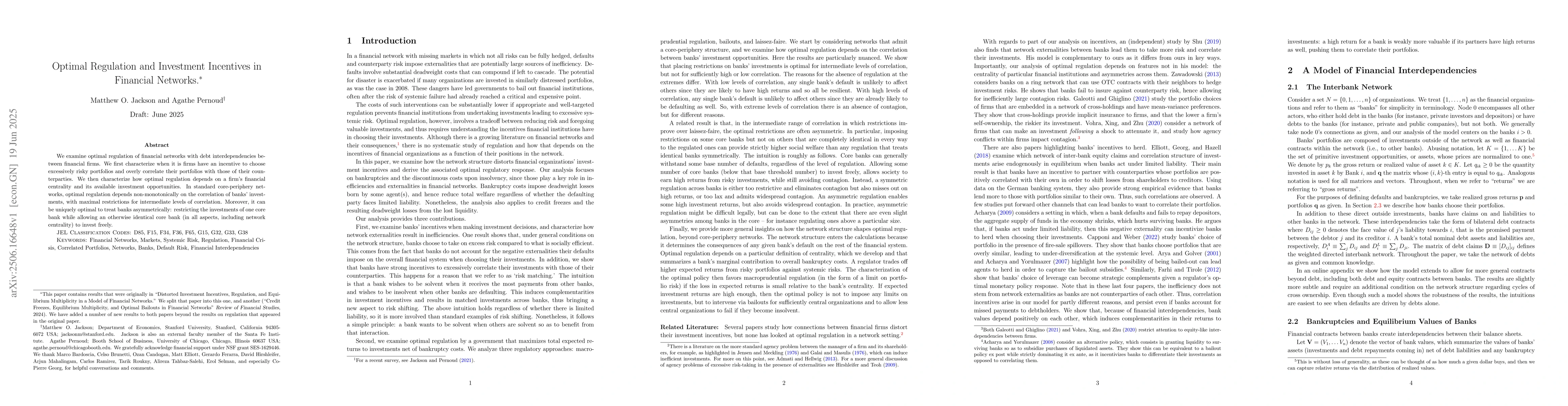 This research identifies conditions under which financial firms choose excessive risk and how regulation can optimally manage these risks. It finds that optimal regulation varies with a firm's importance in the network and investment options, sometimes restricting certain core firms while allowing others to invest freely for systemic stability.