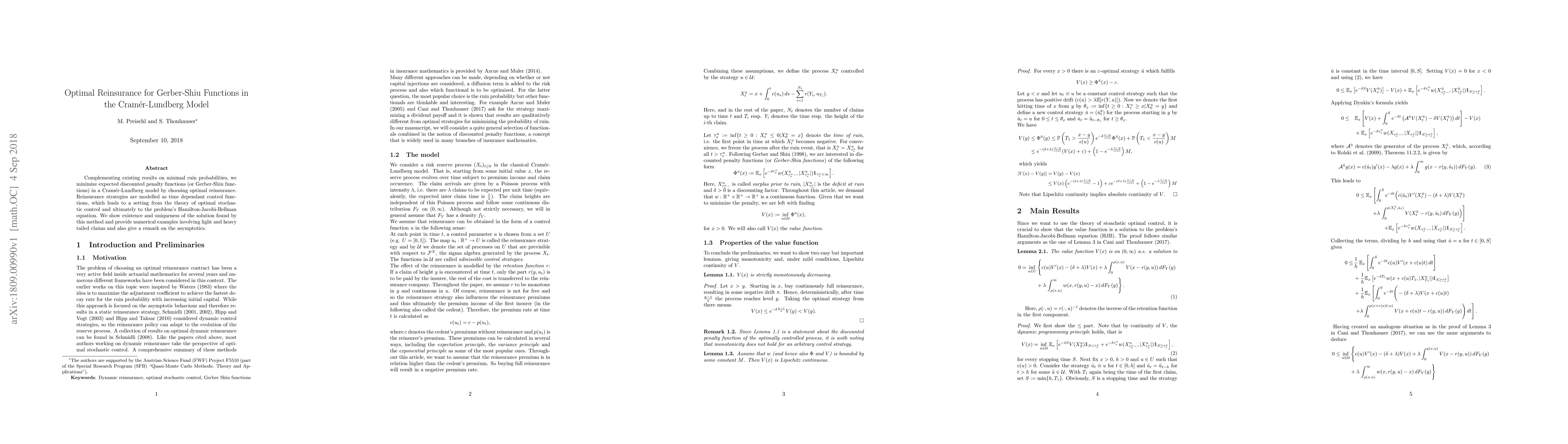 This paper develops optimal reinsurance strategies in the Cramer-Lundberg model to minimize expected discounted penalty functions, modeled as time-dependent control functions. The study utilizes optimal stochastic control theory to derive the Hamilton-Jacobi-Bellman equation and proves the existence and uniqueness of the solution, supplemented by numerical examples for light and heavy-tailed claims.
