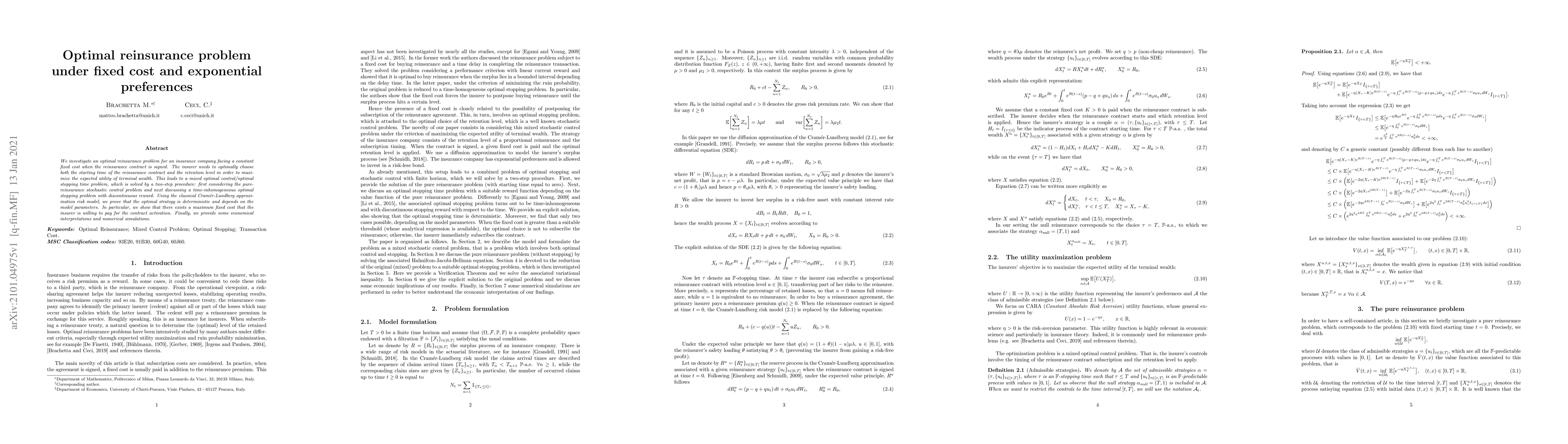 We investigate an optimal reinsurance problem for an insurance company facing a constant fixed cost when the reinsurance contract is signed. The insurer needs to optimally choose both the starting time of the reinsurance contract and the retention level in order to maximize the expected utility of terminal wealth. This leads to a mixed optimal control/optimal stopping time problem, which is solved by a two-step procedure: first considering the pure reinsurance stochastic control problem and next discussing a time-inhomogeneous optimal stopping problem with discontinuous reward. Using the classical Cram\'er-Lundberg approximation risk model, we prove that the optimal strategy is deterministic and depends on the model parameters. In particular, we show that there exists a maximum fixed cost that the insurer is willing to pay for the contract activation. Finally, we provide some economical interpretations and numerical simulations.