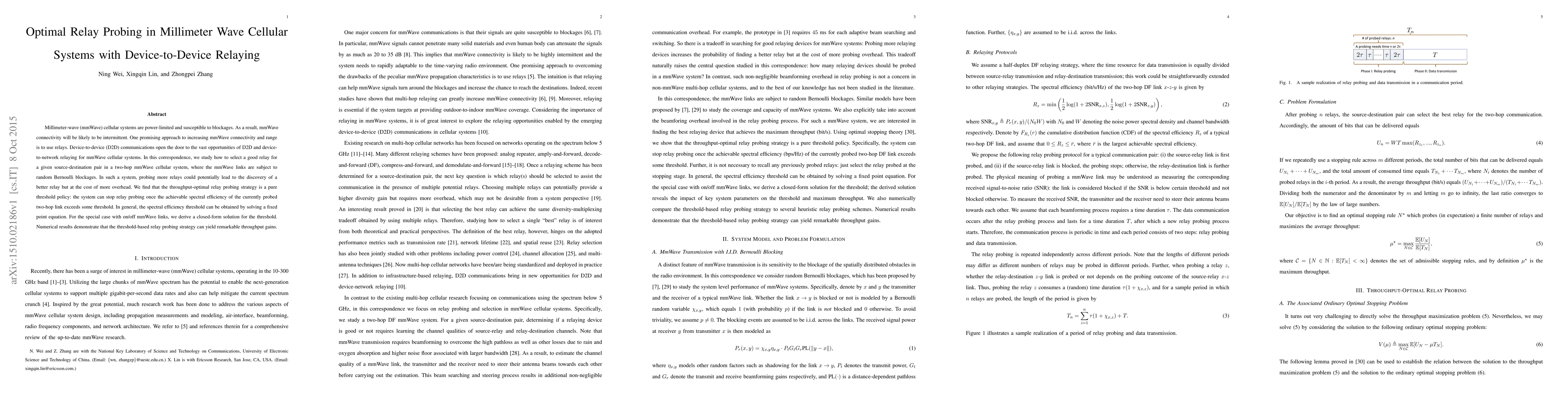 Millimeter-wave (mmWave) cellular systems are power-limited and susceptible to blockages. As a result, mmWave connectivity will be likely to be intermittent. One promising approach to increasing mmWave connectivity and range is to use relays. Device-to-device (D2D) communications open the door to the vast opportunities of D2D and device-to-network relaying for mmWave cellular systems. In this correspondence, we study how to select a good relay for a given source-destination pair in a two-hop mmWave cellular system, where the mmWave links are subject to random Bernoulli blockages. In such a system, probing more relays could potentially lead to the discovery of a better relay but at the cost of more overhead. We find that the throughput-optimal relay probing strategy is a pure threshold policy: the system can stop relay probing once the achievable spectral efficiency of the currently probed two-hop link exceeds some threshold. In general, the spectral efficiency threshold can be obtained by solving a fixed point equation. For the special case with on/off mmWave links, we derive a closed-form solution for the threshold. Numerical results demonstrate that the threshold-based relay probing strategy can yield remarkable throughput gains.