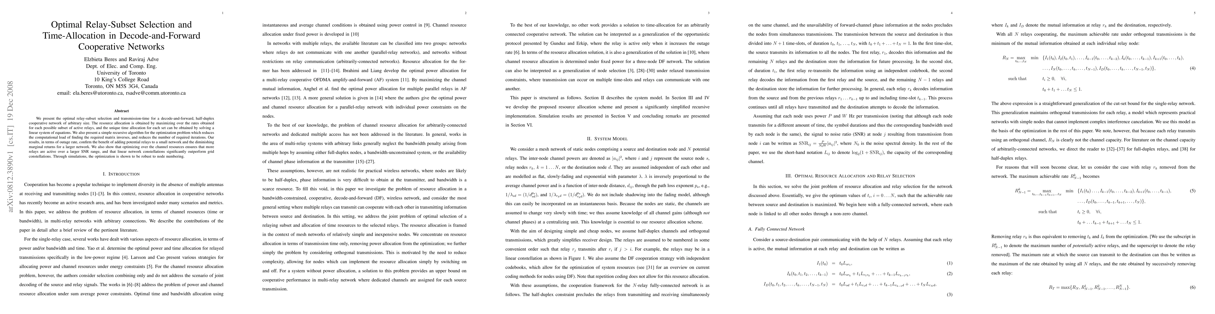 This paper proposes optimal relay-subset selection and time-allocation strategies for decode-and-forward cooperative networks, achieving improved performance through a recursive algorithm that simplifies matrix inversions. Simulation results demonstrate enhanced network performance and robustness to node numbering.