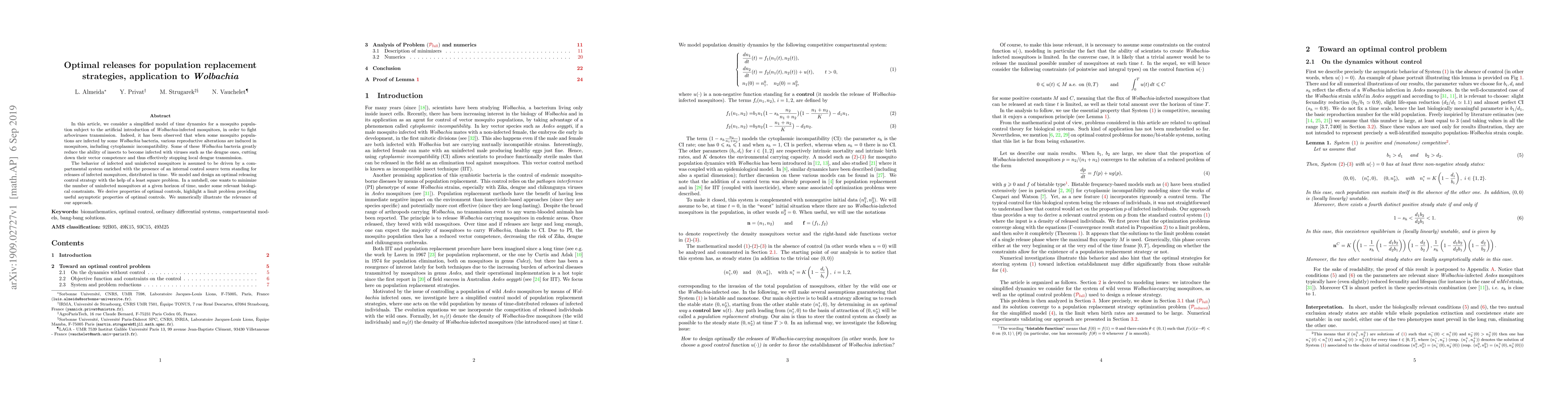 In this article, we consider a simplified model of time dynamics for a mosquito population subject to the artificial introduction of {\itshape Wolbachia}-infected mosquitoes, in order to fight arboviruses transmission.Indeed, it has been observed that when some mosquito populations are infected by some {\itshape Wolbachia} bacteria, various reproductive alterations are induced in mosquitoes, including cytoplasmic incompatibility. Some of these {\itshape Wolbachia} bacteria greatly reduce the ability of insects to become infected with viruses such as the dengue ones, cutting down their vector competence and thus effectively stopping local dengue transmission.The behavior of infected and uninfected mosquitoes is assumed to be driven by a compartmental system enriched with the presence of an internal control source term standing for releases of infected mosquitoes, distributed in time. We model and design an optimal releasing control strategy with the help of a least square problem. In a nutshell, one wants to minimize the number of uninfected mosquitoes at a given horizon of time, under some relevant biological constraints. We derive properties of optimal controls, highlight a limit problem providing useful asymptotic properties of optimal controls. We numerically illustrate the relevance of our approach.