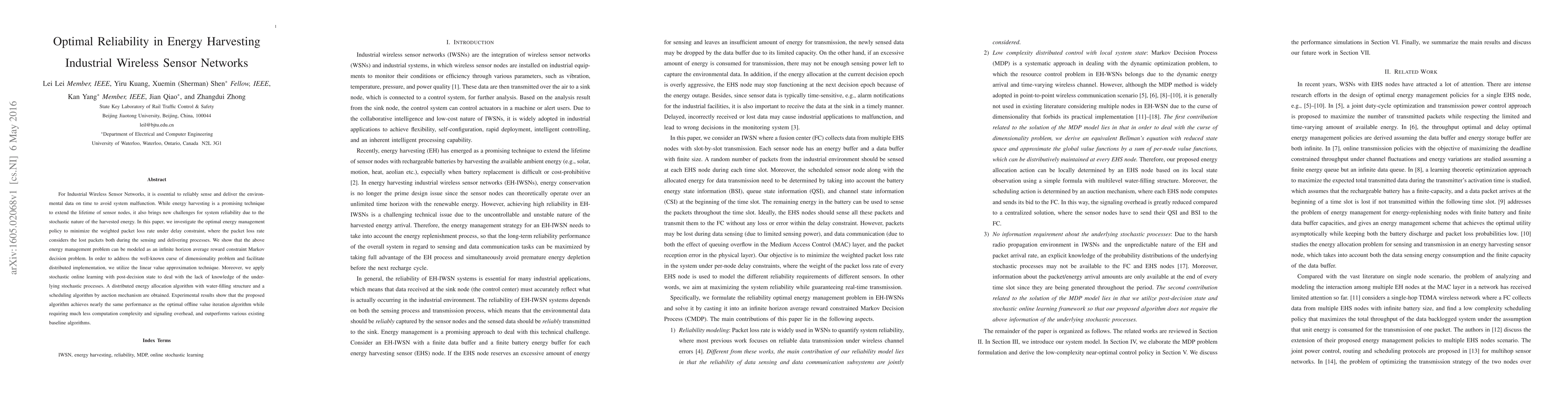 This paper explores optimal energy management policies for industrial wireless sensor networks using energy harvesting, aiming to minimize packet loss under delay constraints. The proposed solution involves a distributed algorithm with a water-filling structure and auction-based scheduling, leveraging linear value approximation and stochastic online learning to address the high dimensionality and stochastic nature of the problem.