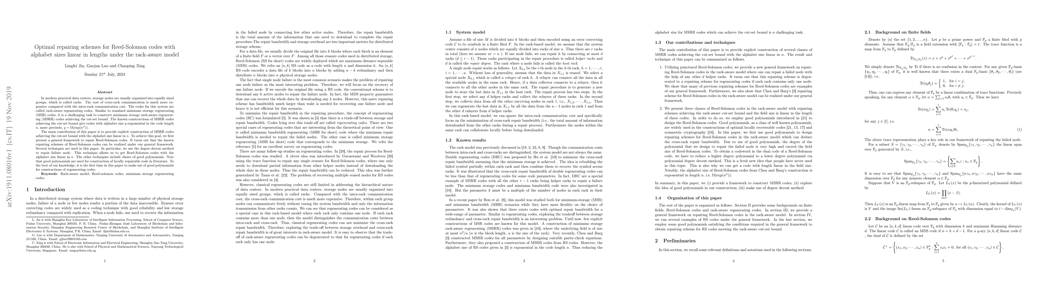 This paper presents an explicit construction of minimum storage rack-aware regenerating codes achieving the cut-set bound, with an alphabet size linear in the code length. The authors utilize a general framework for repairing Reed-Solomon codes, employing techniques like degree decent and good polynomials to achieve this optimization.