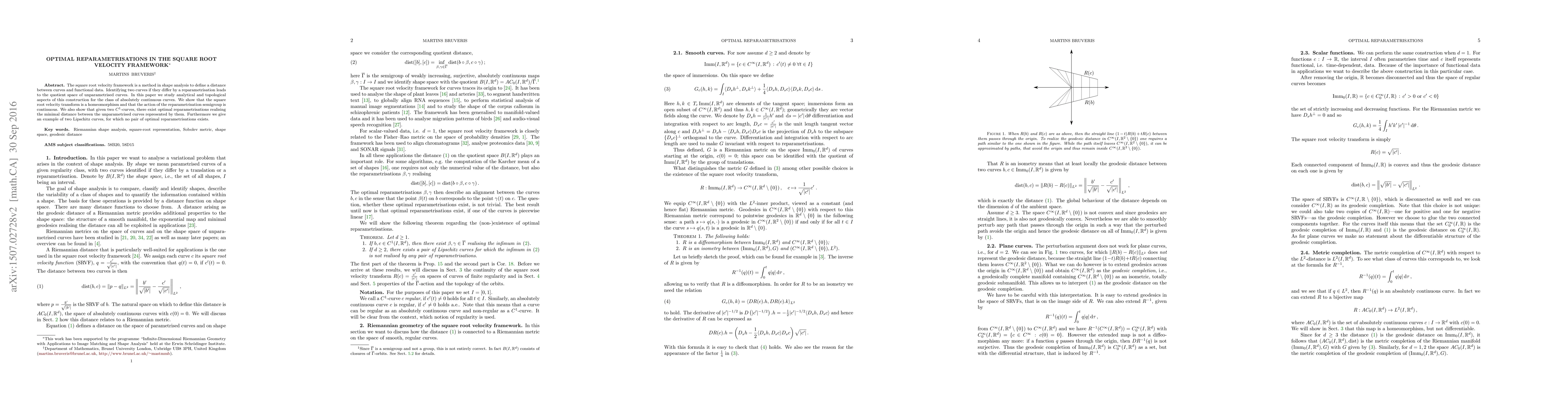This paper investigates the analytical and topological properties of the square root velocity framework for shape analysis, proving that the square root velocity transform is a homeomorphism and that reparametrisation actions are continuous. It also demonstrates the existence of optimal reparametrisations for $C^1$-curves minimizing the distance between their unparametrised forms, while noting the absence of such optimal reparametrisations for certain Lipschitz curves.